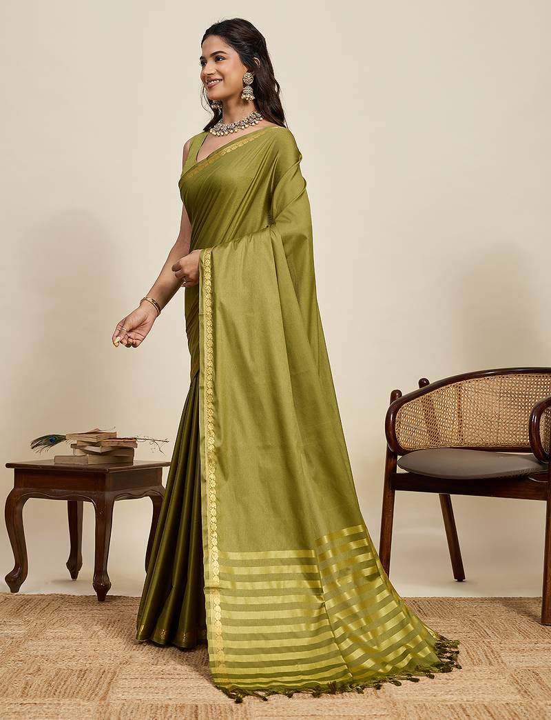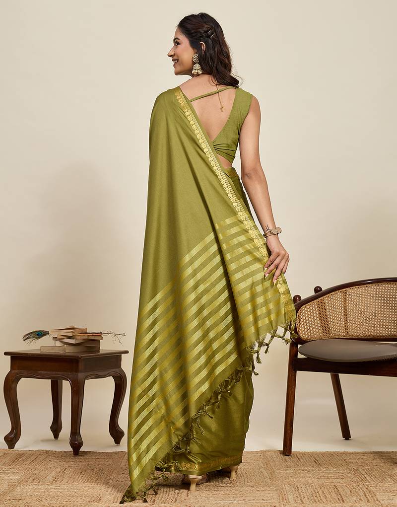 Graceful olive green silk blend saree with gold zari border and striped pallu with unstiched blouse piece