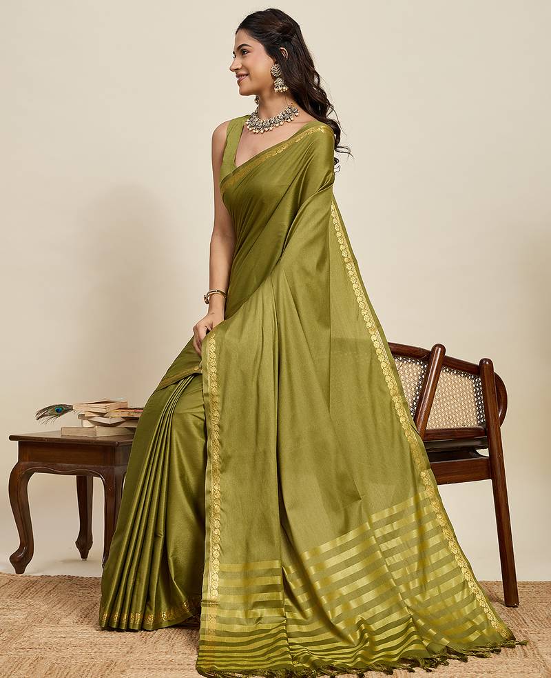 | Product Name | Graceful Olive Green Silk Blend Saree With Gold Zari Border And Striped Pallu With Unstiched Blouse Piece | |