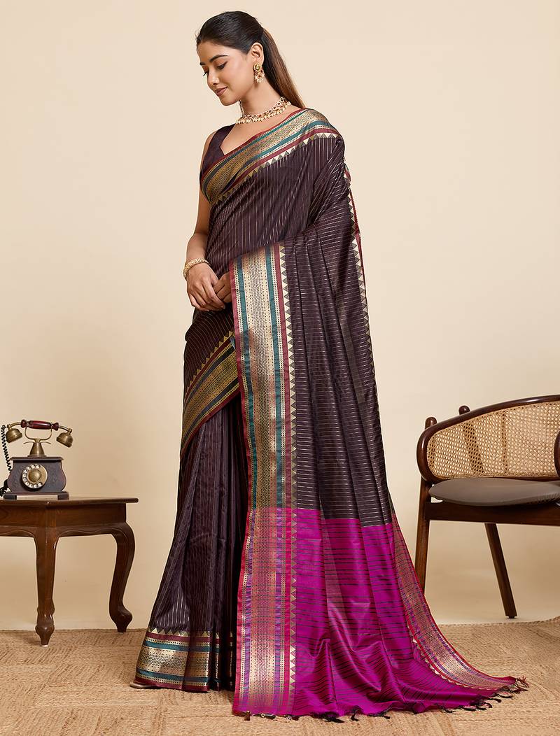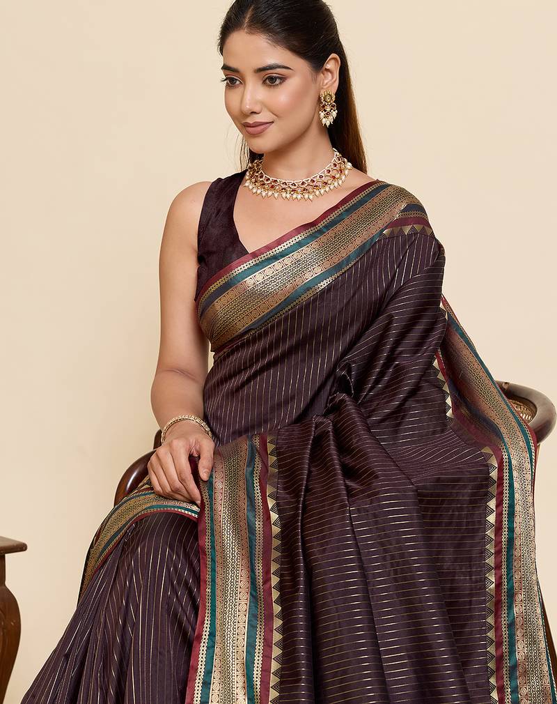 Women's dark brown zari striped two tone pallu silk blend saree with rich border and unstiched blouse piece