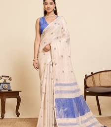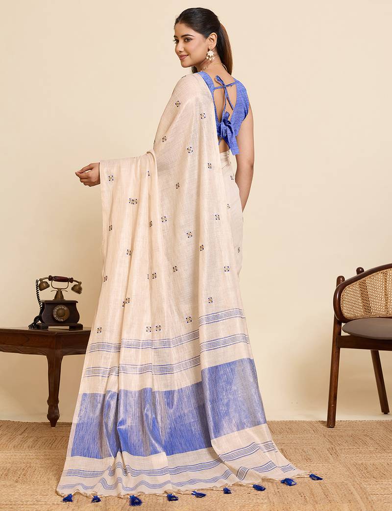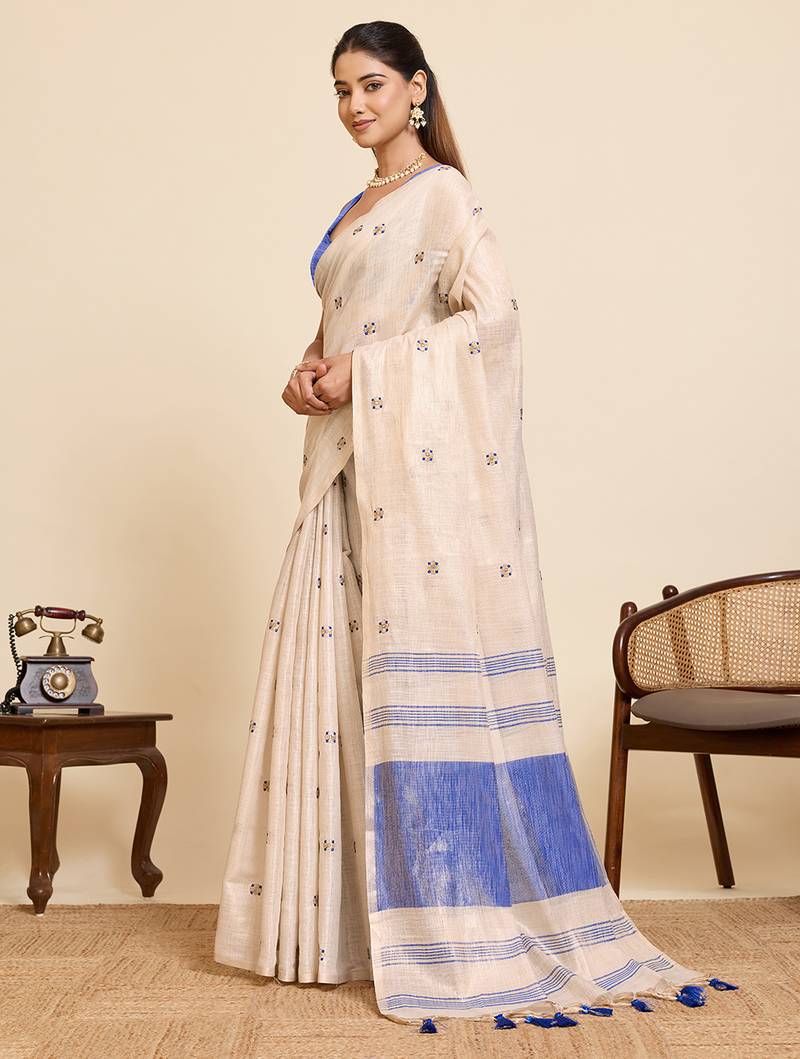 Women's elegant blue linen blend saree with unstiched blouse piece