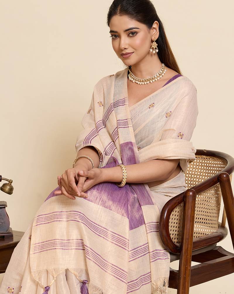 | Product Description | Enhance Your Ethnic Collection With This Elegant Linen Blend Saree Featuring Classy Color Stripes And Delicate Butti All Over. Crafted From Lightweight Breathable Fabric, This Saree Offers A Soft Texture And Graceful Drape, Making It Ideal For Daily Wear, Office Wear, Festive Gatherings, Pooja Functions, Casual Celebrations, And Traditional Occasions. The Sophisticated Contrast Pallu With Tassel Detailing Adds A Stylish Modern Touch While Maintaining Timeless Ethnic Charm. Pair It With Statement Jewelry And Heels For A Refined And Graceful Look. Perfect For Women Who Love Simple, Classy, And Comfortable Sarees With Traditional Elegance. |