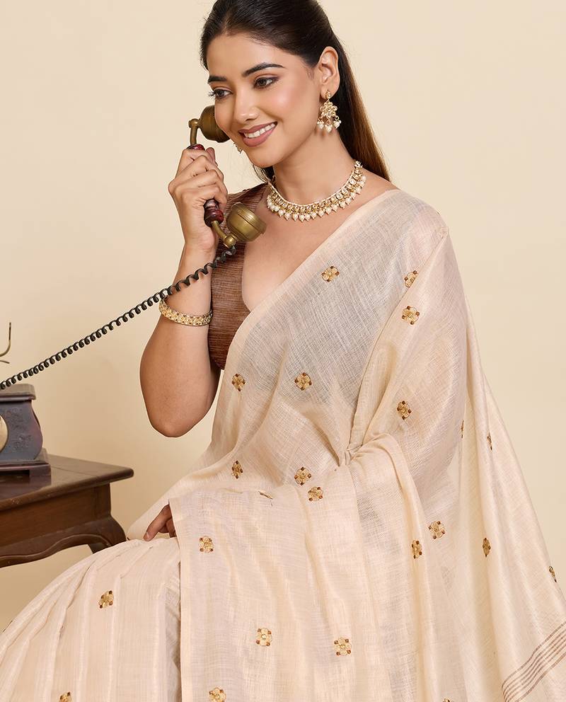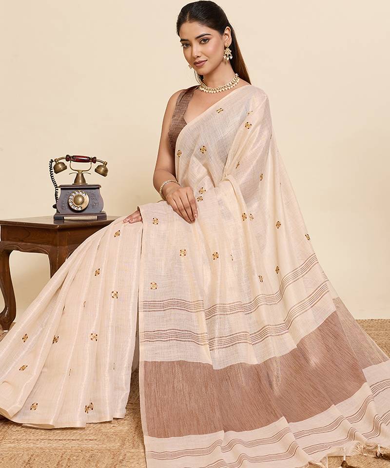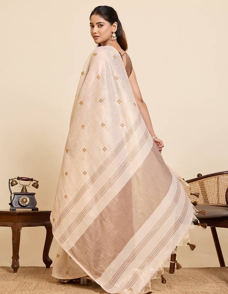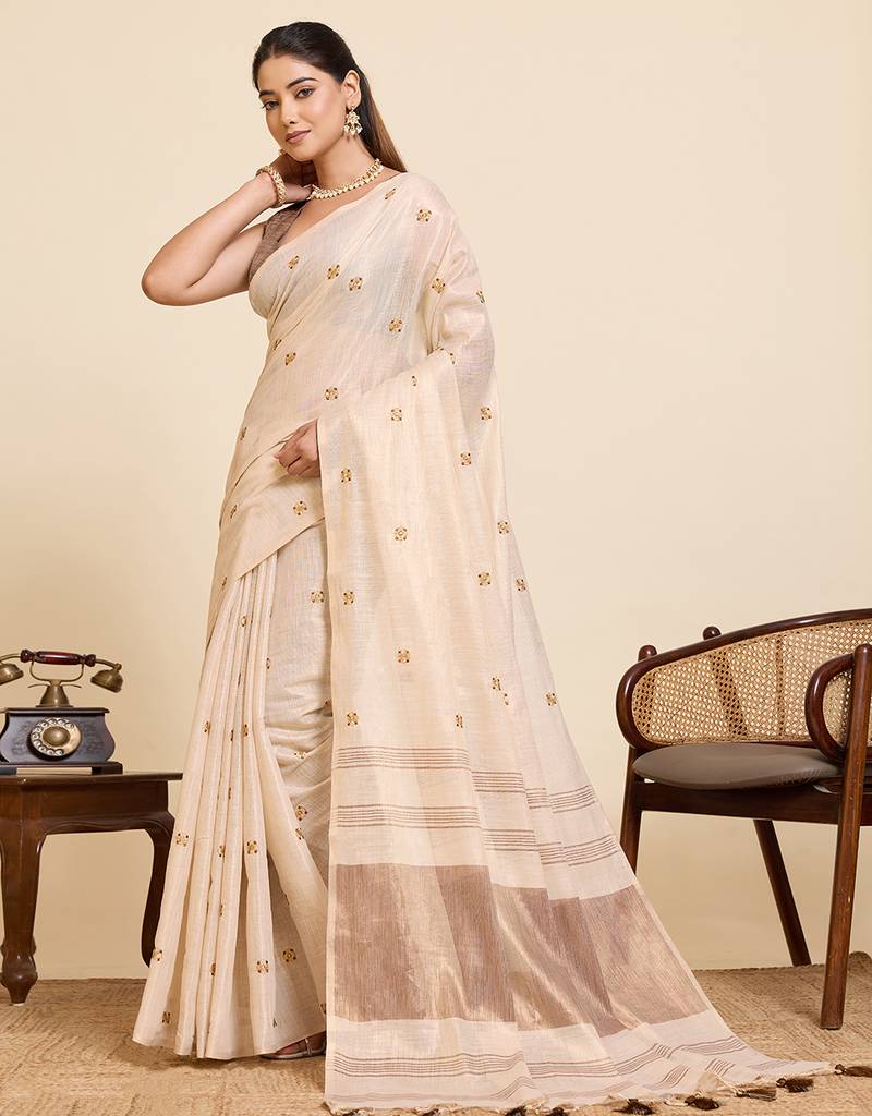 | Product Description | Enhance Your Ethnic Collection With This Elegant Linen Blend Saree Featuring Classy Color Stripes And Delicate Butti All Over. Crafted From Lightweight Breathable Fabric, This Saree Offers A Soft Texture And Graceful Drape, Making It Ideal For Daily Wear, Office Wear, Festive Gatherings, Pooja Functions, Casual Celebrations, And Traditional Occasions. The Sophisticated Contrast Pallu With Tassel Detailing Adds A Stylish Modern Touch While Maintaining Timeless Ethnic Charm. Pair It With Statement Jewelry And Heels For A Refined And Graceful Look. Perfect For Women Who Love Simple, Classy, And Comfortable Sarees With Traditional Elegance. |
