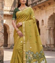 Women's green floral printed cotton saree with unstiched blouse piece