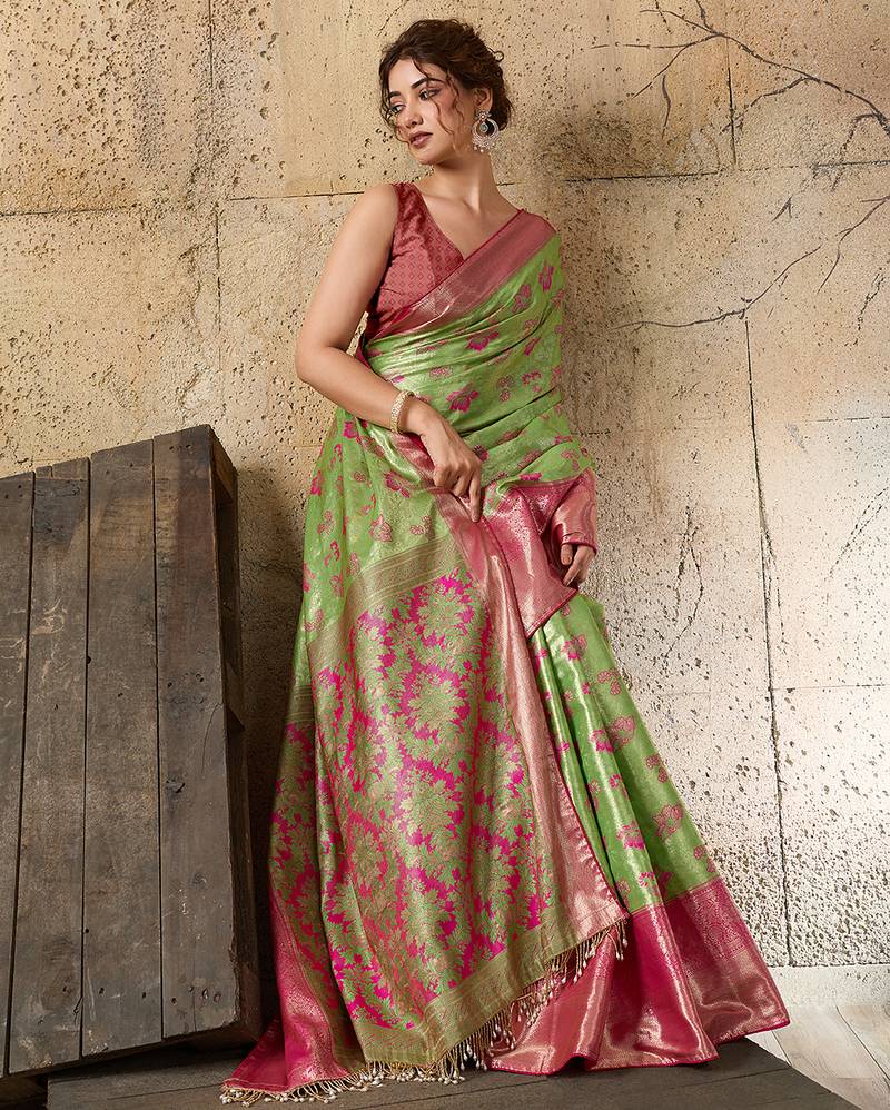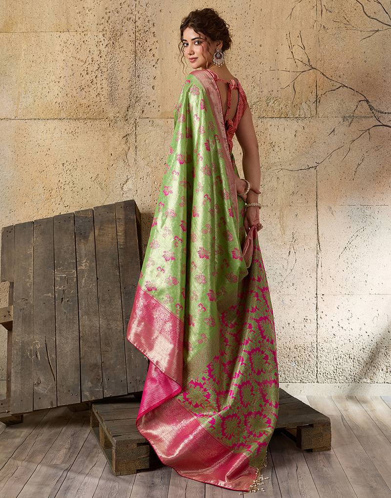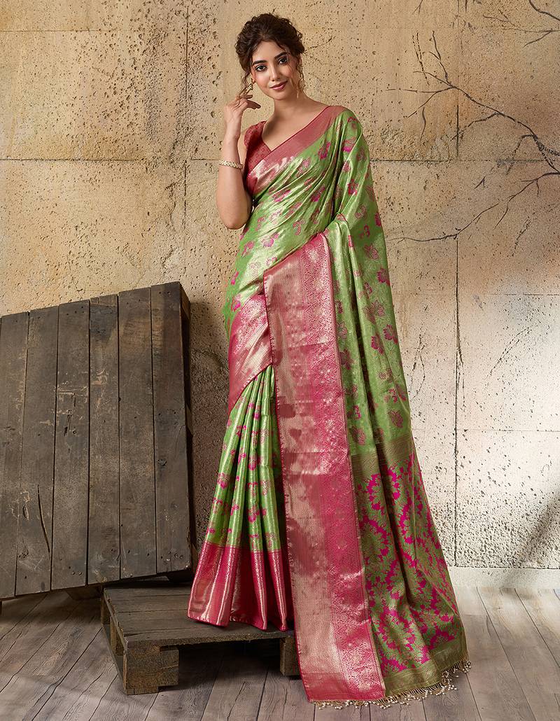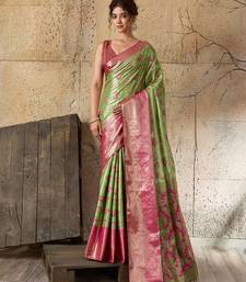 Women's green silk blend saree with rich zari woven design and traditional border with unstiched blouse piece