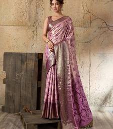 Women's lavender silk blend saree with rich zari woven design and traditional border with unstiched blouse piece