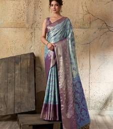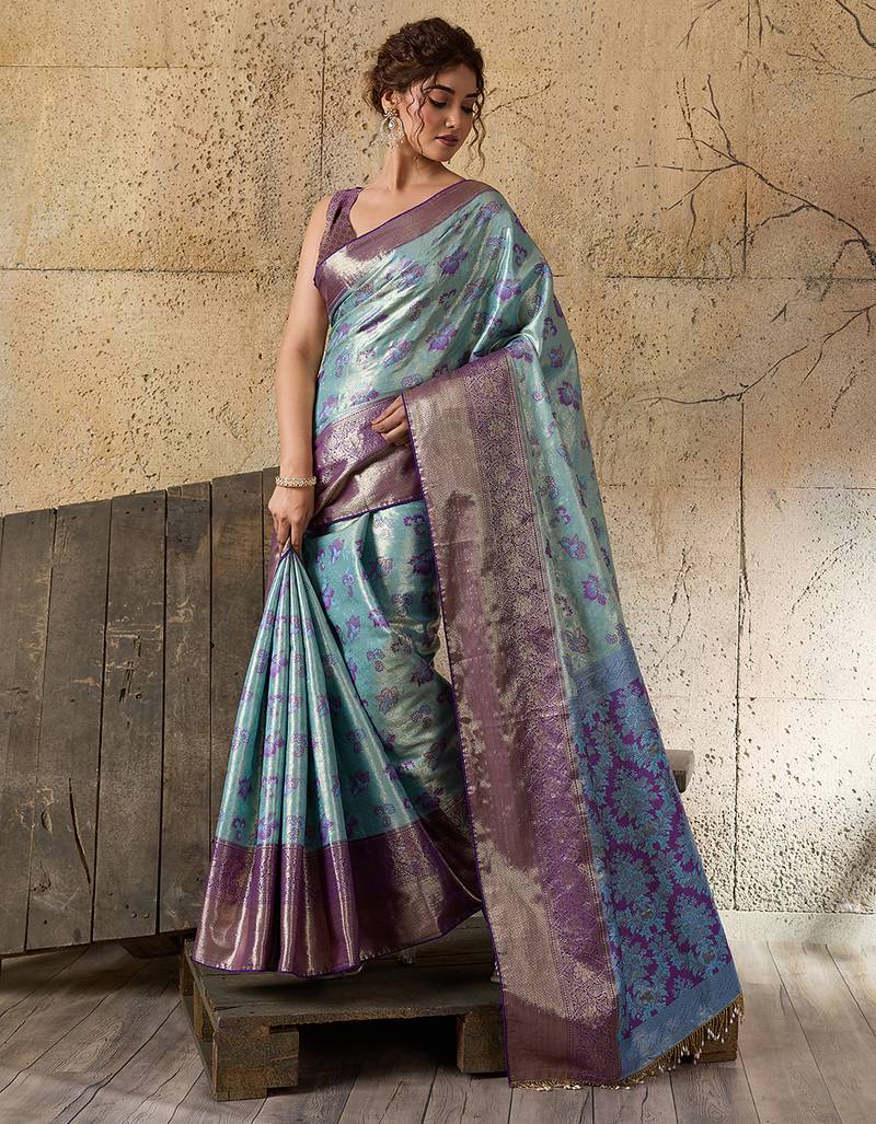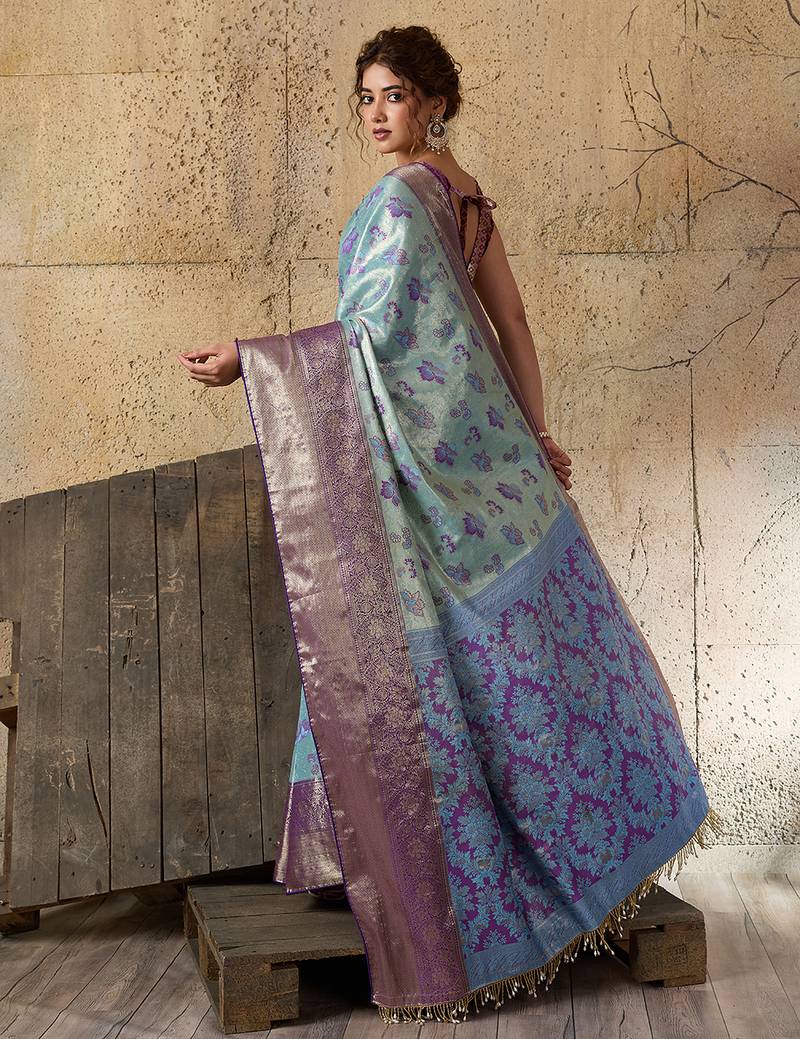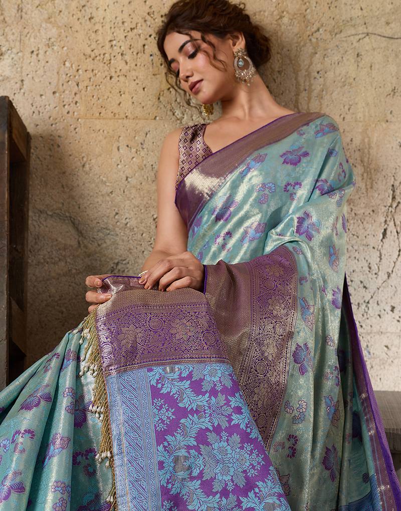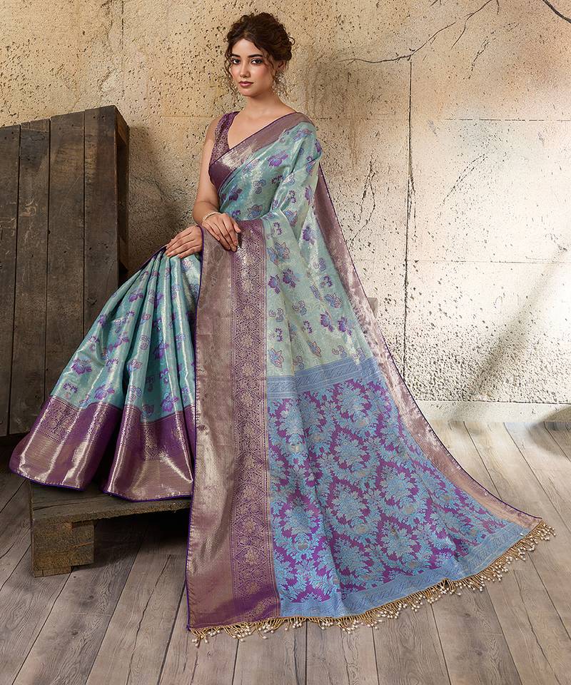 Women's sky blue silk blend saree with rich zari woven design and traditional border with unstiched blouse piece