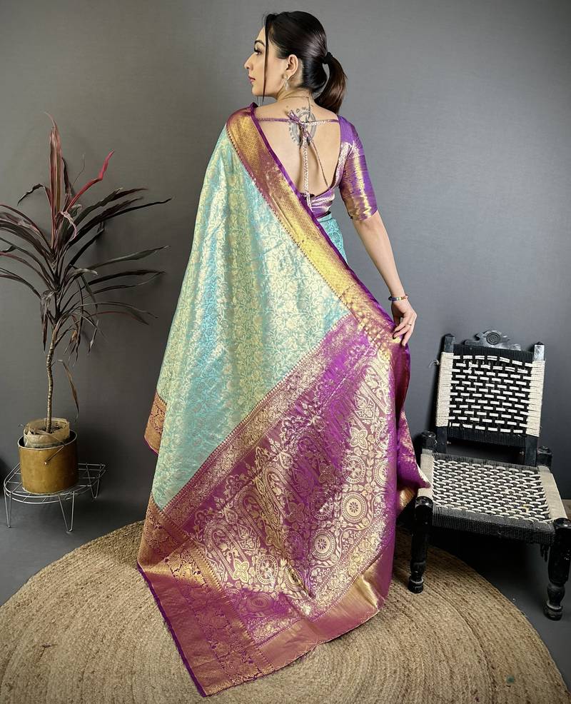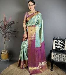 Aqua blue, purple floral, zari woven kanjivaram silk saree with blouse