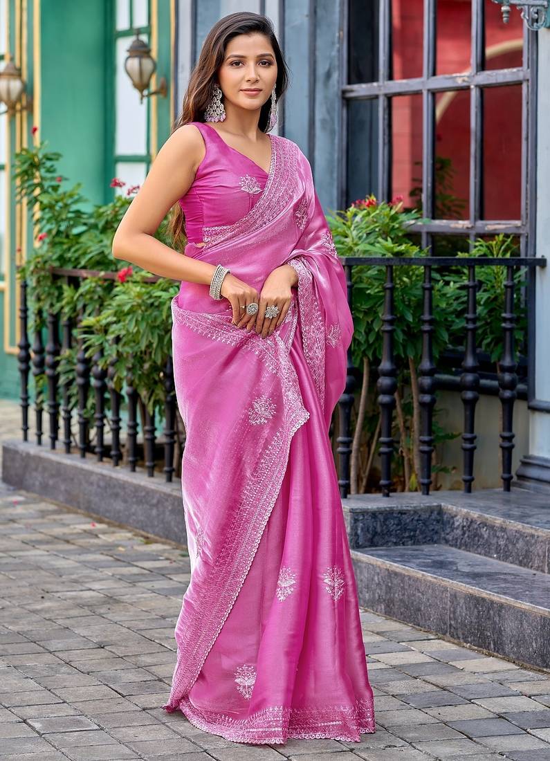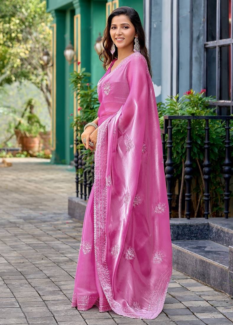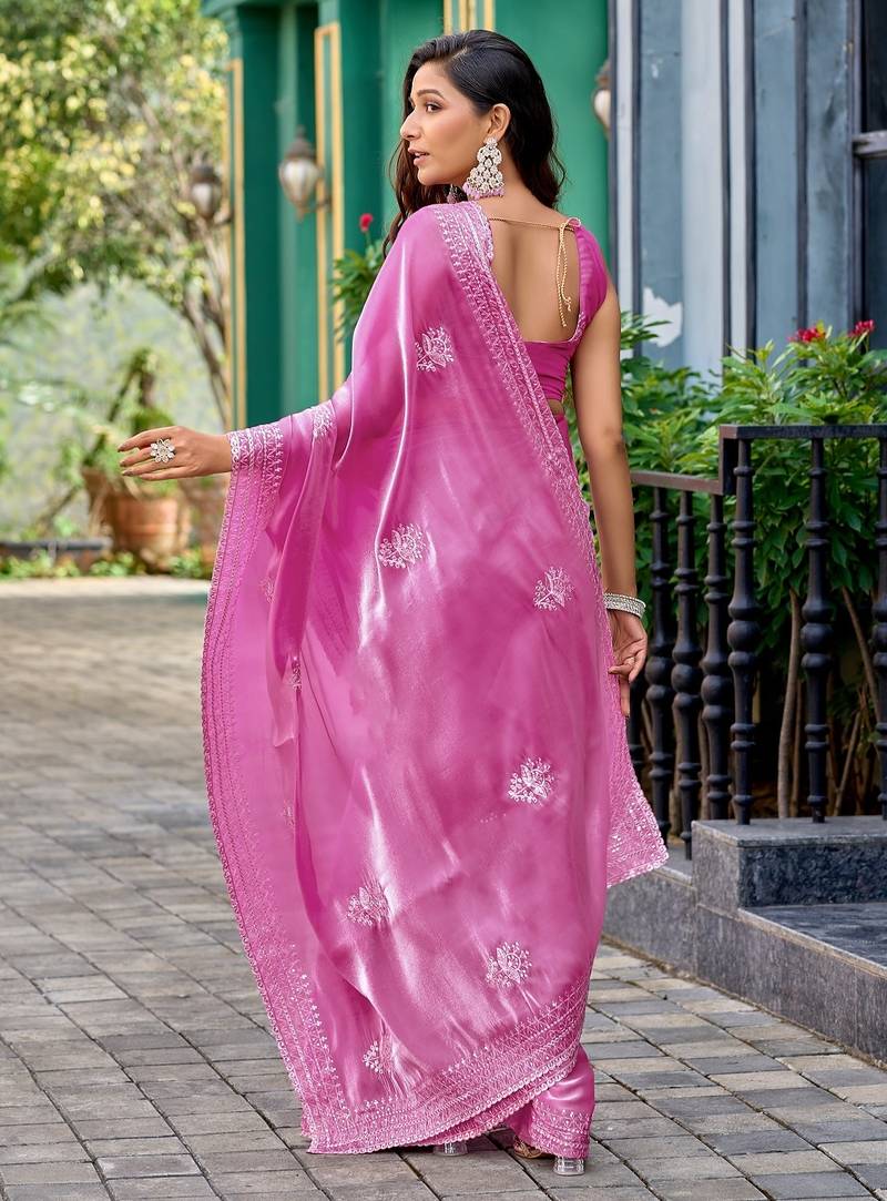 Baby pink embroidered embellished shimmer chiffon bollywood saree with blouse