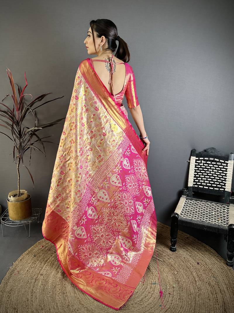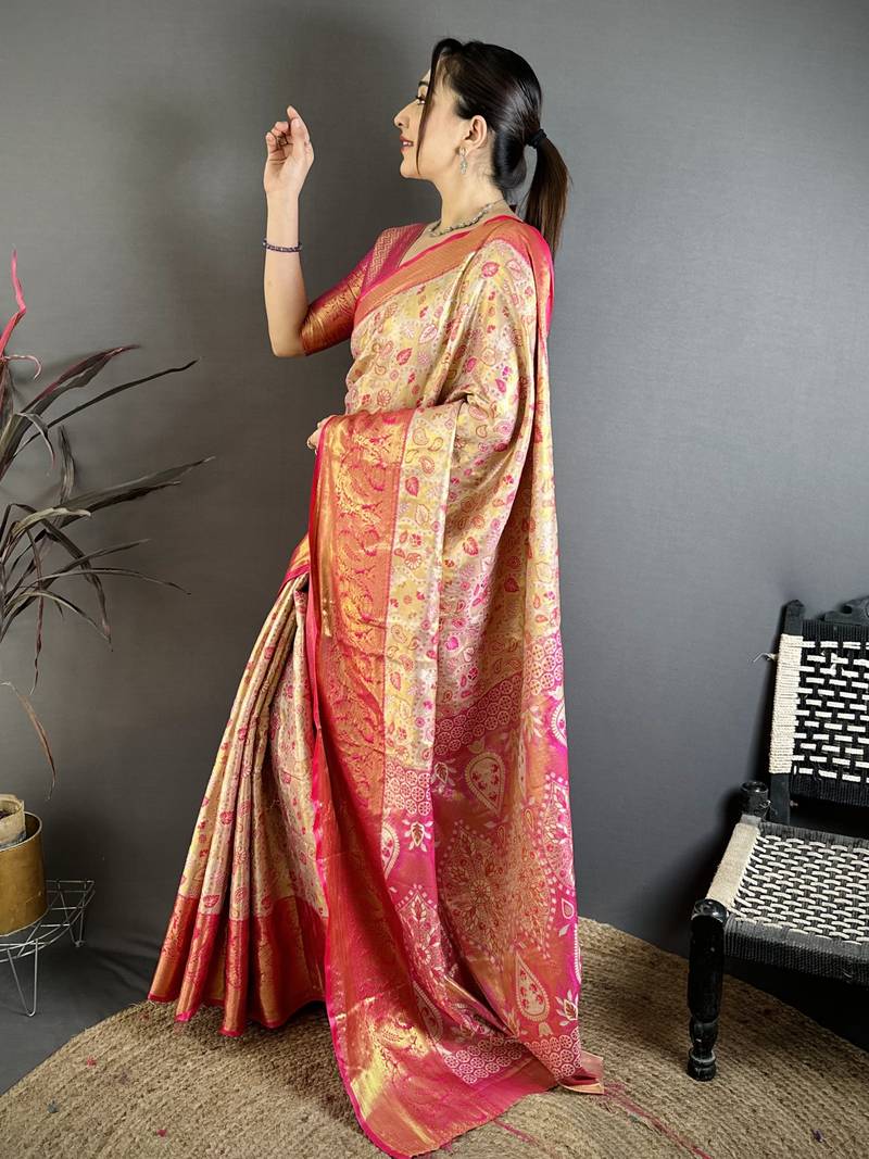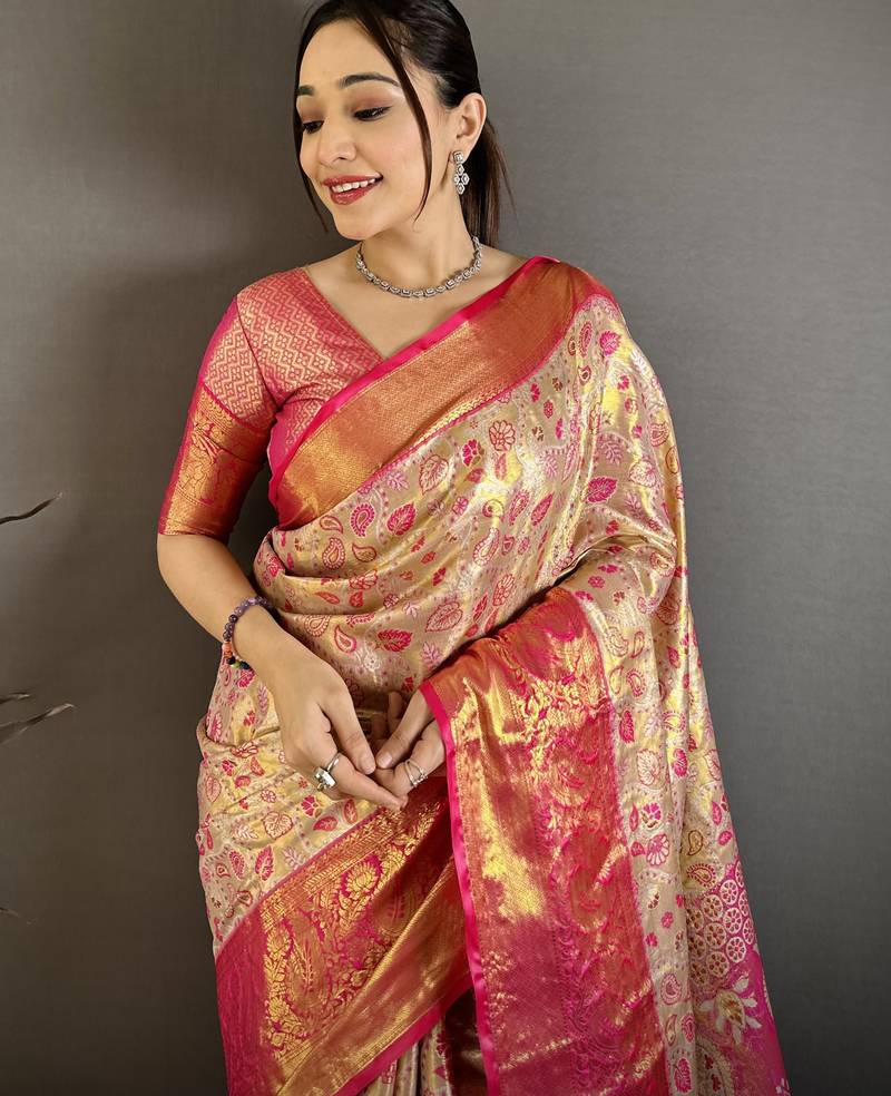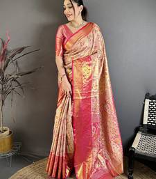Beige, pink floral, paisely, zari woven kanjivaram semi silk saree with blouse