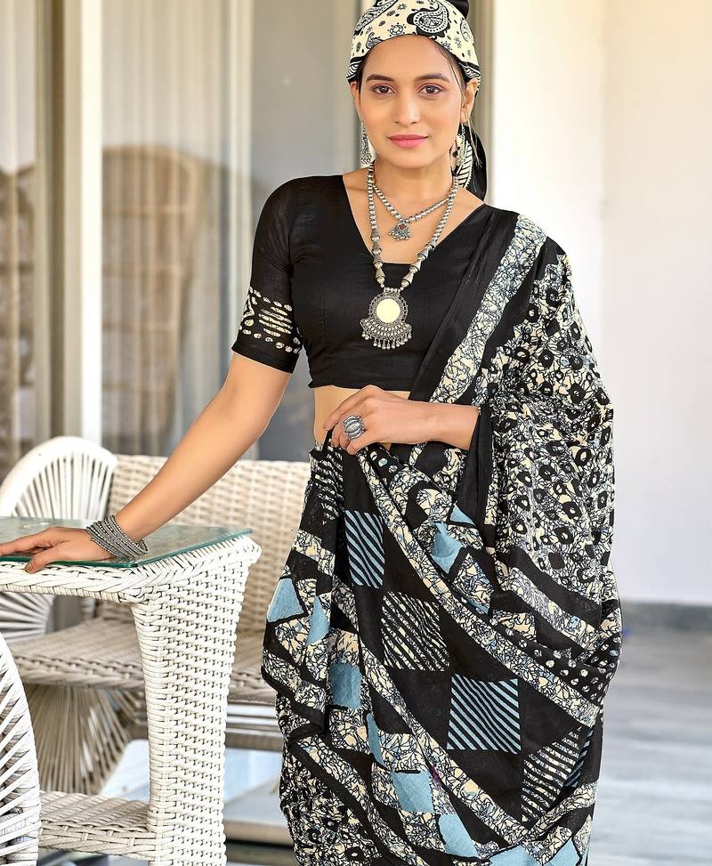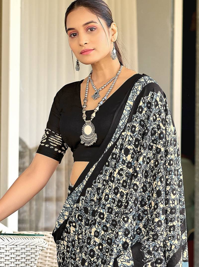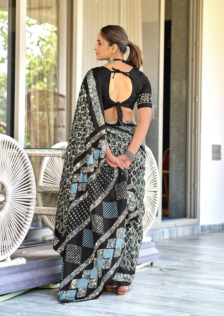 Black batik print mulmul cotton saree with blouse.