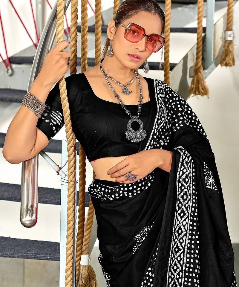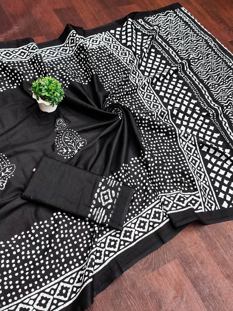 Black batik print mulmul cotton saree with blouse.