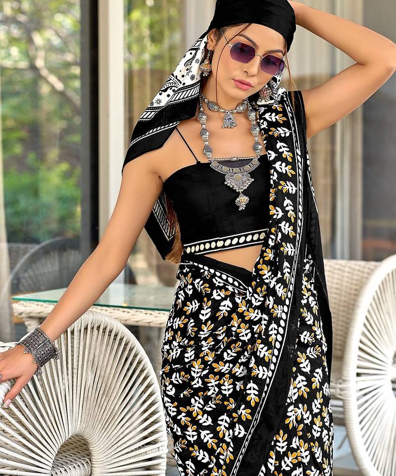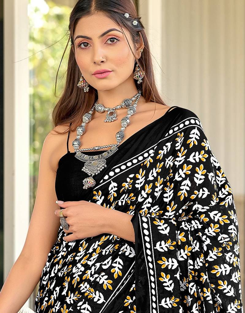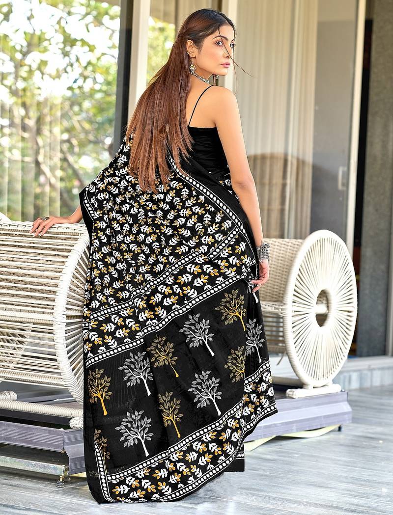 Black floral print mulmul cotton saree with blouse.
