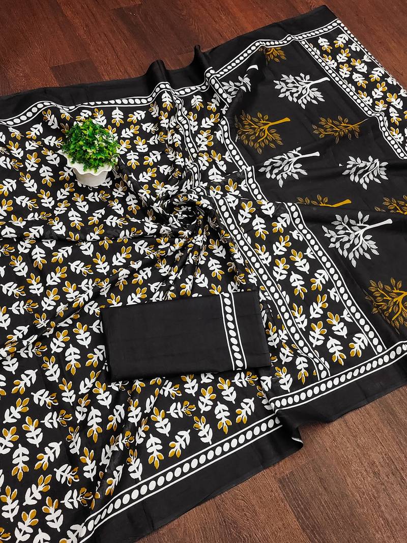| Product Name | Black Floral Print Mulmul Cotton Saree With Blouse. | |