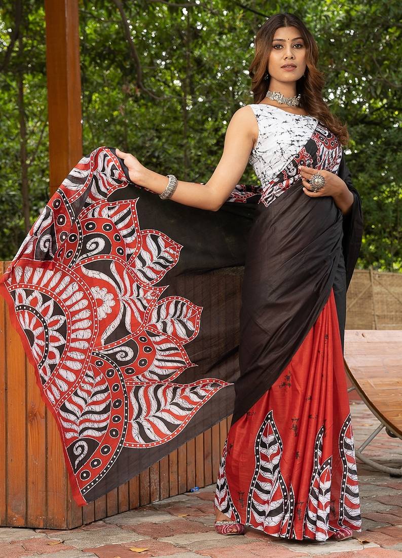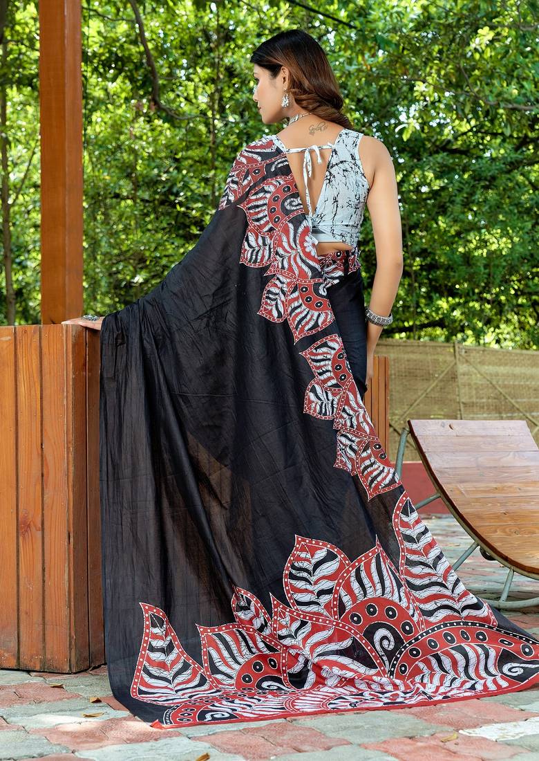 Black printed mulmul cotton saree with blouse.