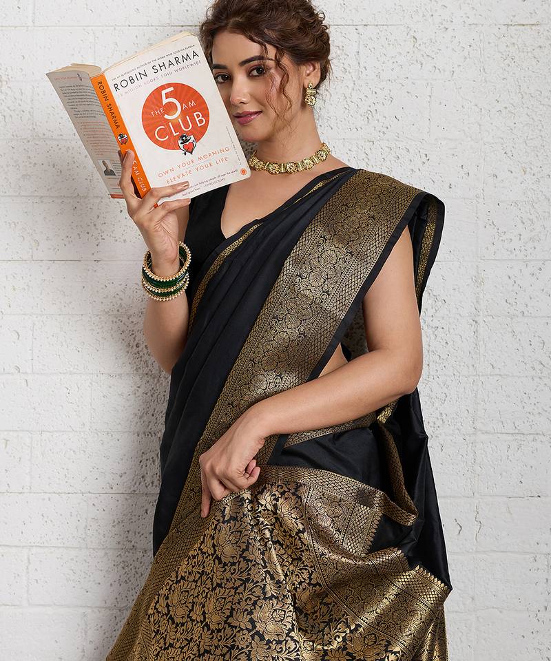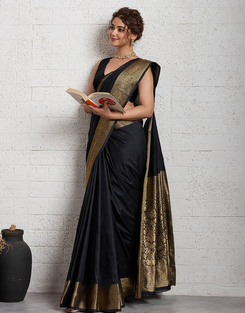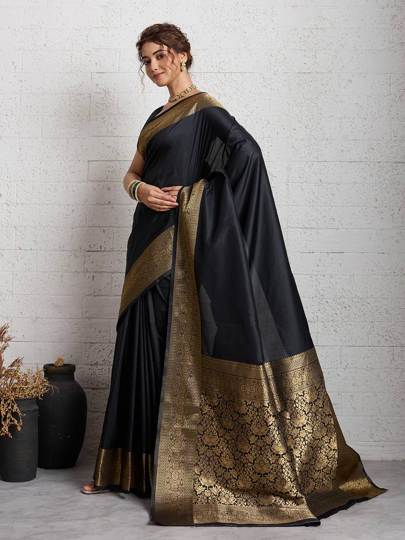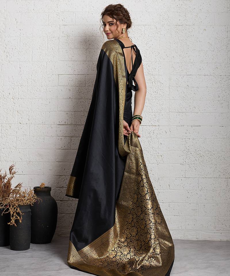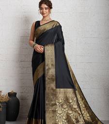 Black woven, self design, embellished pure silk banarasi saree with blouse