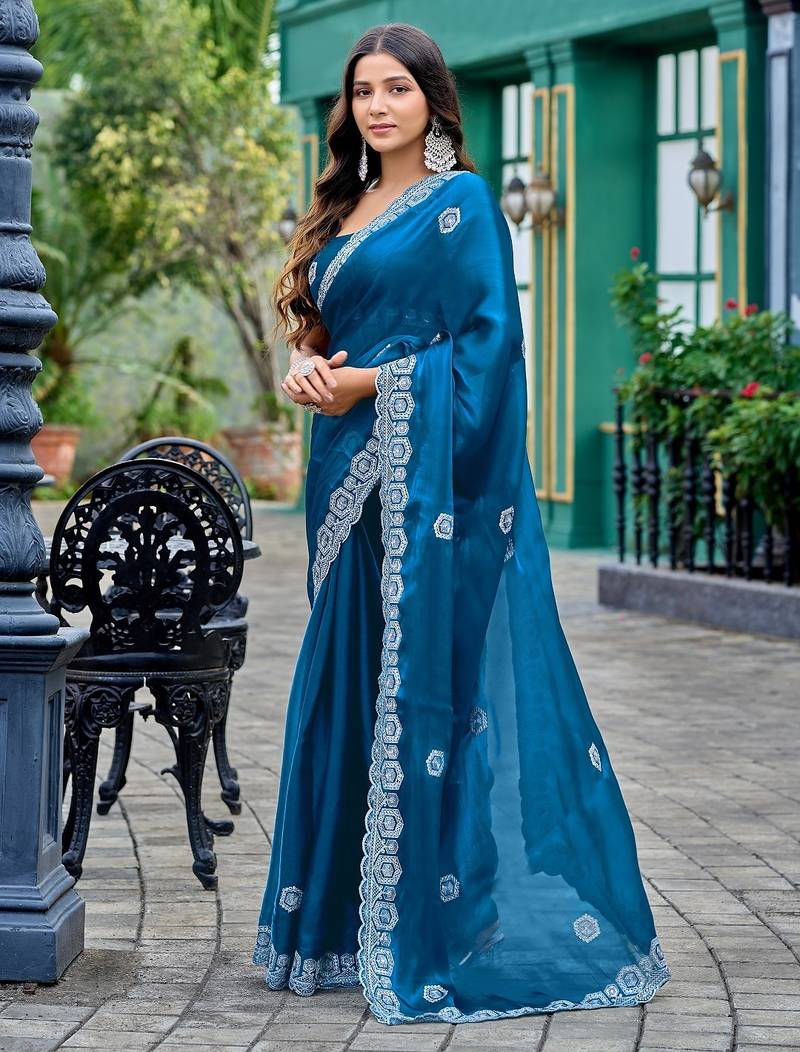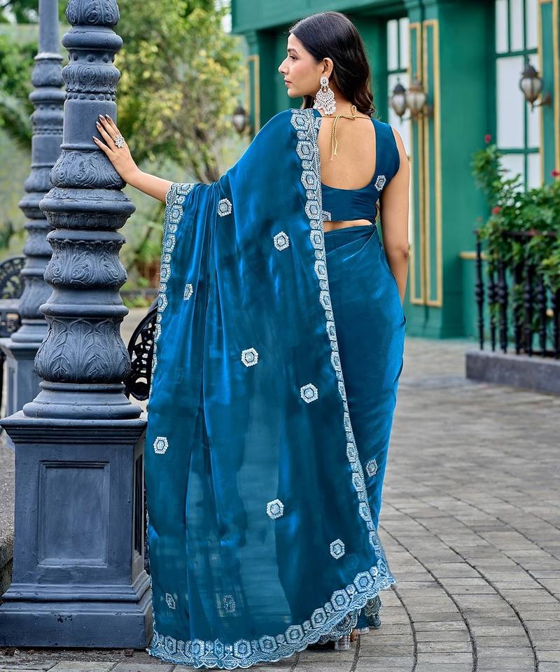 Blue embroidered embellished shimmer chiffon bollywood saree with blouse