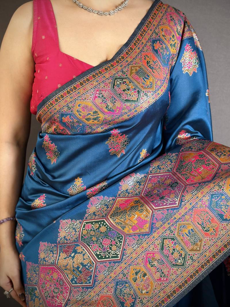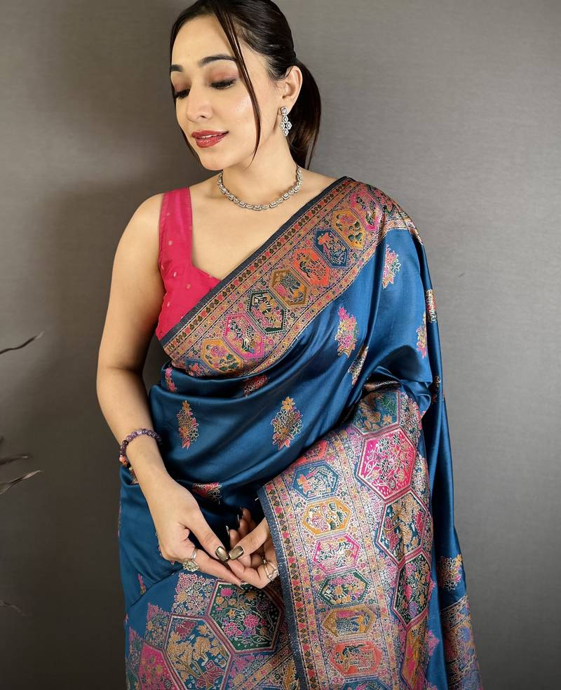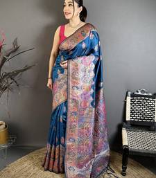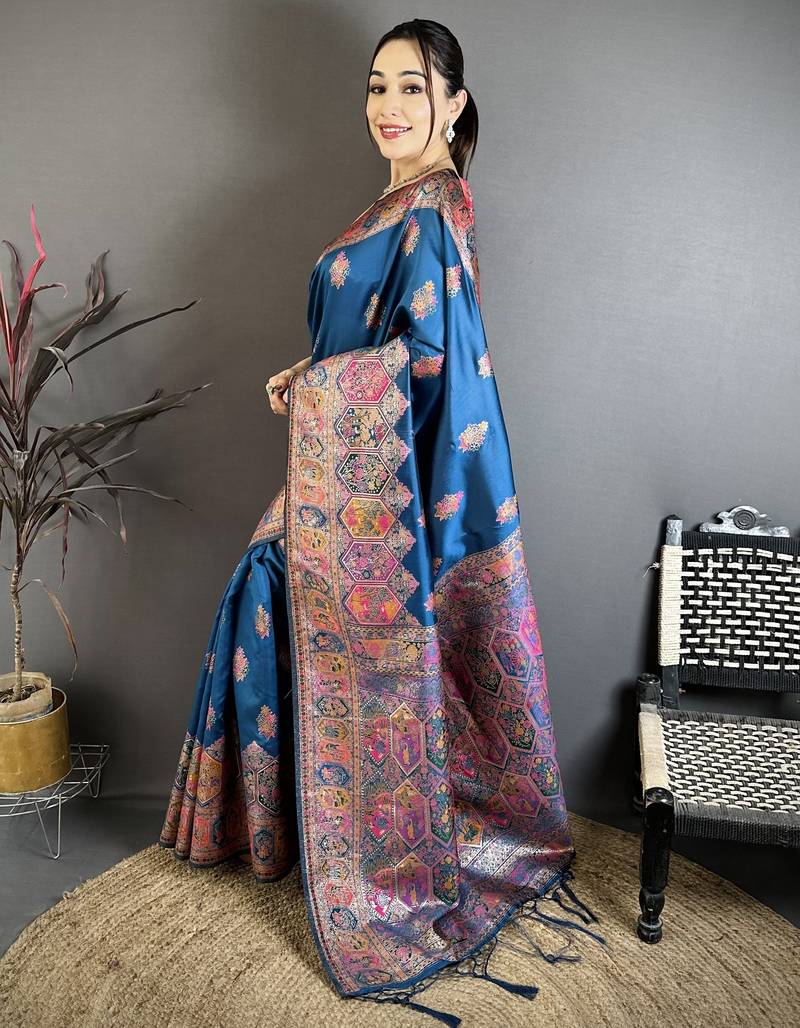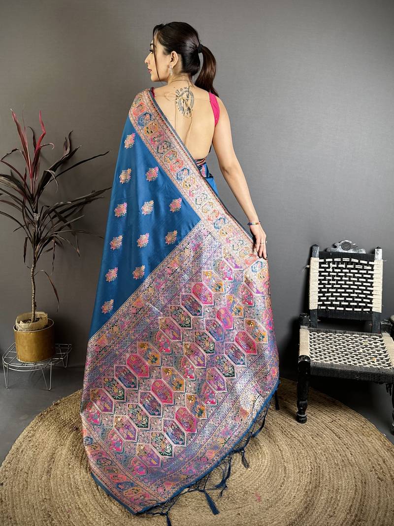 Blue floral, meenakari, zari woven pashmina silk saree with blouse
