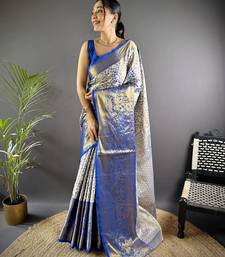 Blue floral, peacock zari woven kanjivaram tissue silk saree with blouse