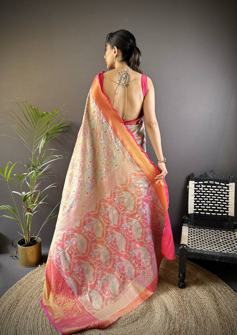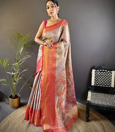 Blue floral, peacock zari woven tissue silk saree with blouse