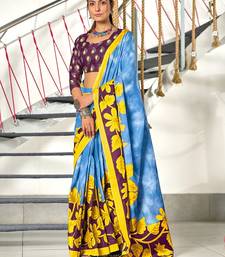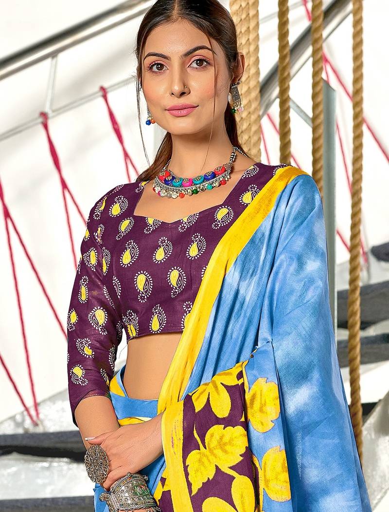 Blue floral print mulmul cotton saree with blouse.
