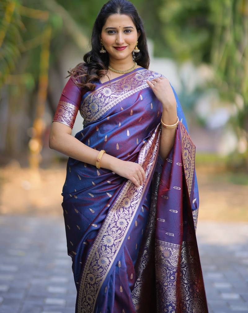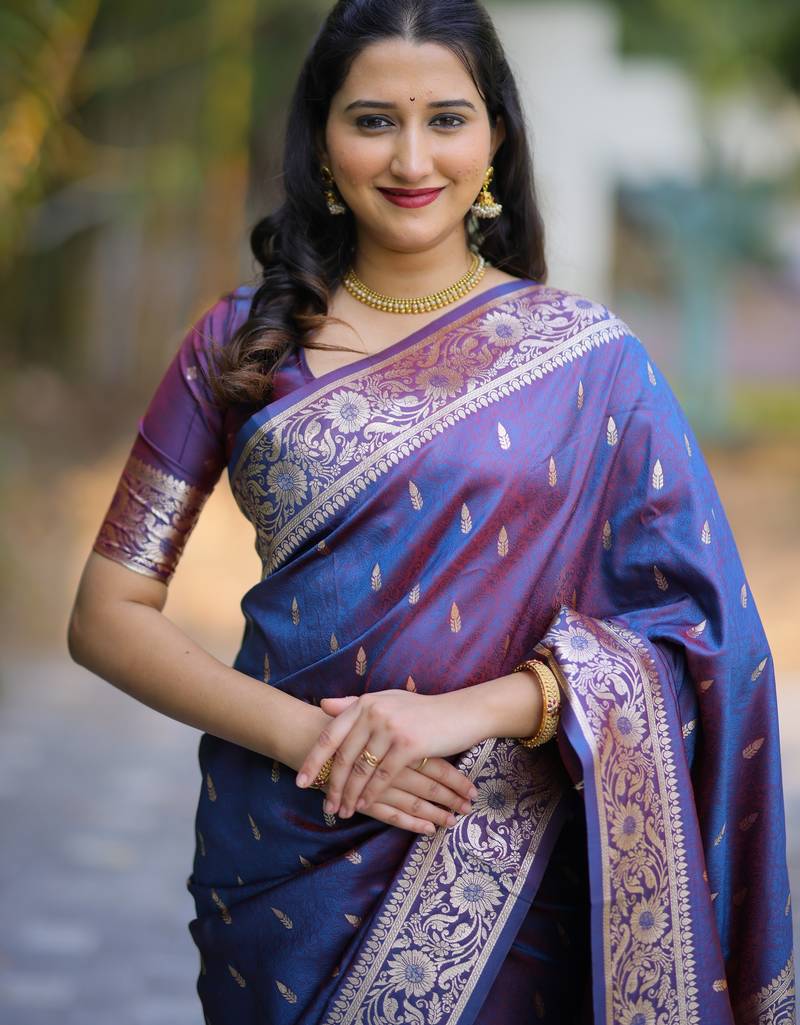 Blue floral, zari work banarasi silk saree with blouse