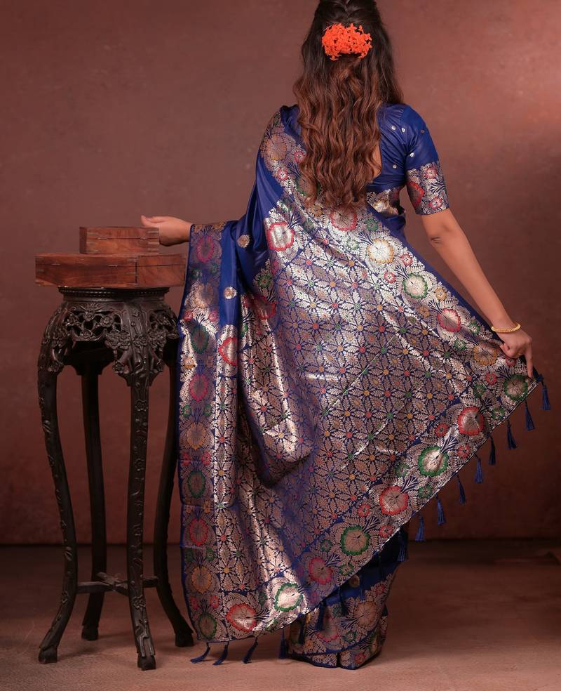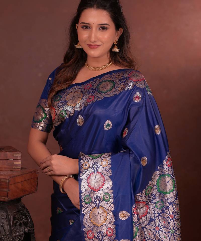 Product Name Blue Floral, Zari Work Slik Blend Saree With Blouse