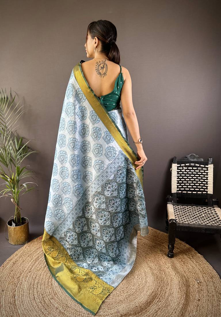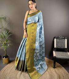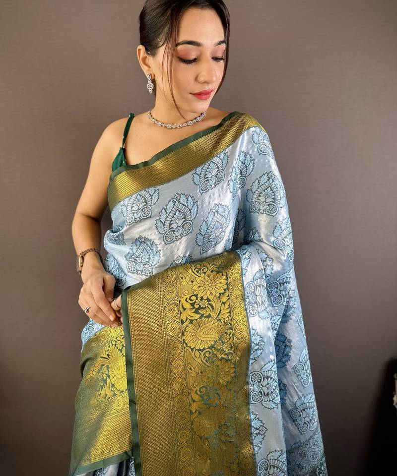 Blue floral, zari woven kanjivaram tissue silk saree with blouse