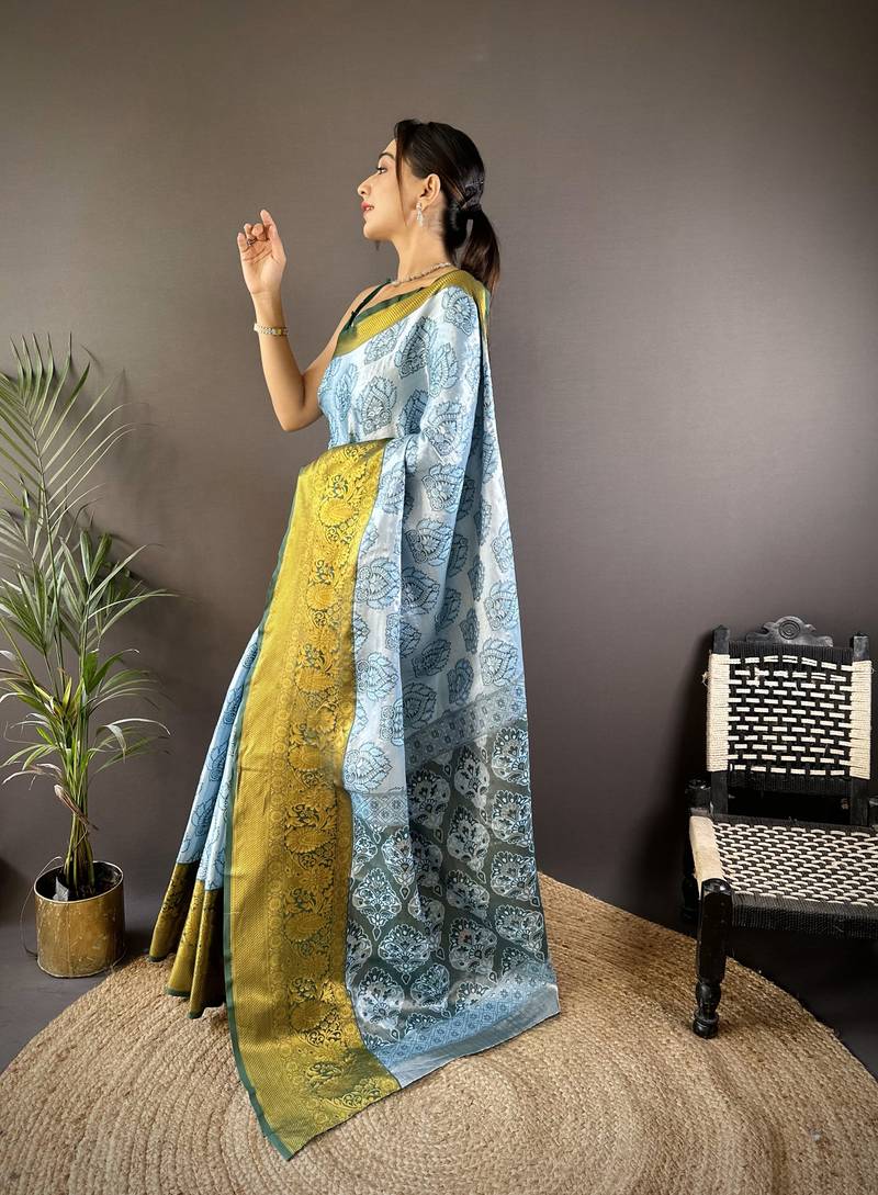 | Product Description | Drape Yourself In Timeless Elegance With This Exquisite Woven Saree. Crafted From Luxurious Silk Fabric, This Saree Features Intricate Zari Weaving That Beautifully Blends Traditional Artistry With Modern Sophistication. The Rich Gold Pallu And Border Are Adorned With Detailed Floral And Paisley Motifs, Adding A Regal Touch To The Ensemble. The Subtle Olive Green Base Enhances The Grandeur, Making It Perfect For Festive Occasions, Weddings, And Special Celebrations. |