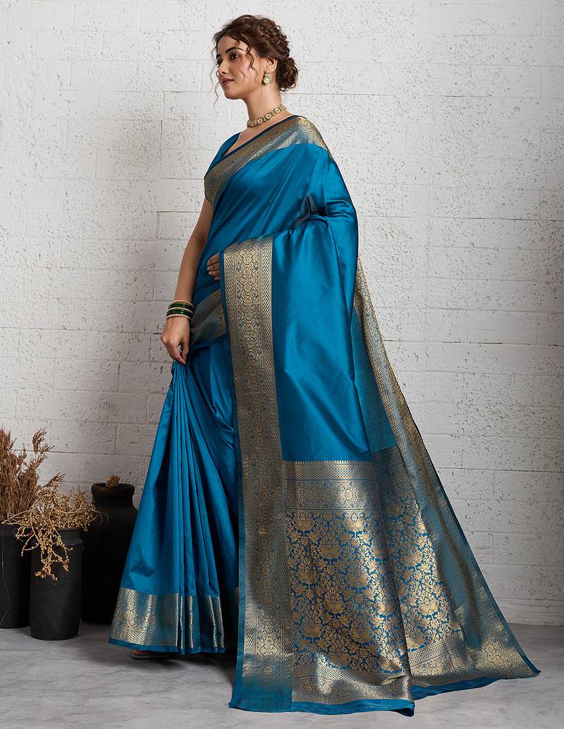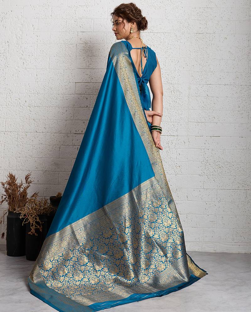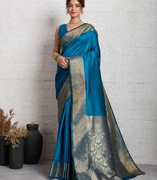 Blue woven, self design, embellished pure silk banarasi saree with blouse