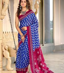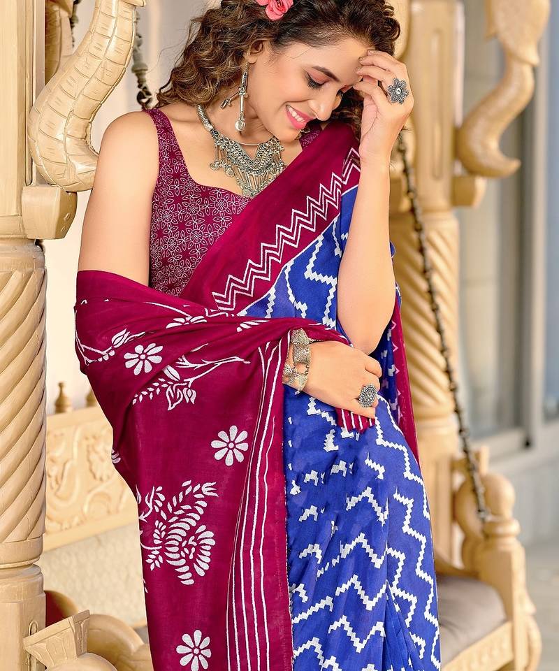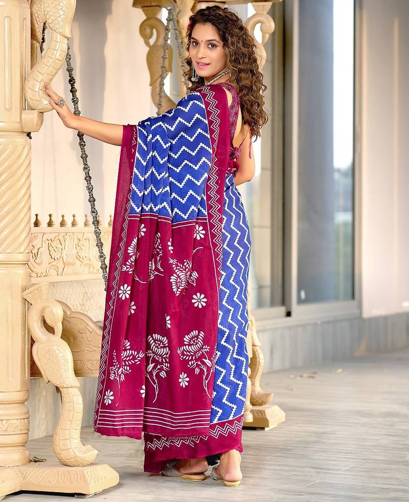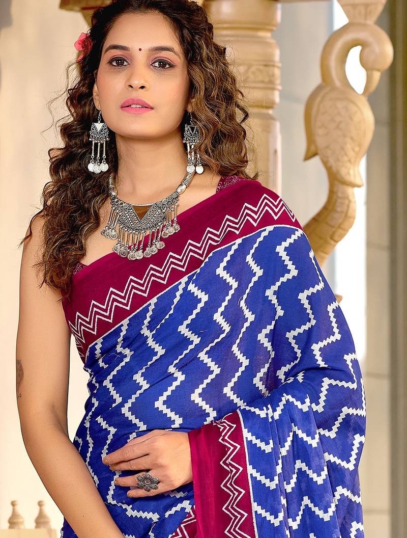 Blue zigzag, floral print mulmul cotton saree with blouse.