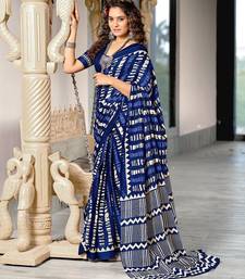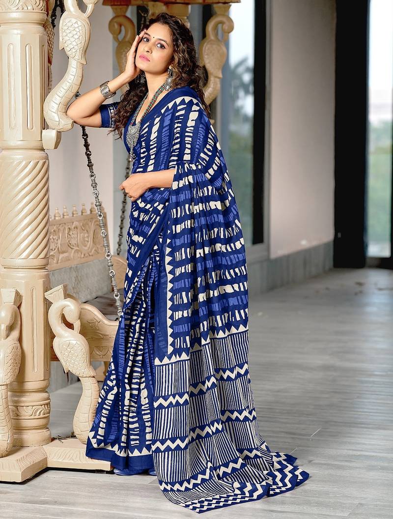 Blue zigzag, striped print mulmul cotton saree with blouse.