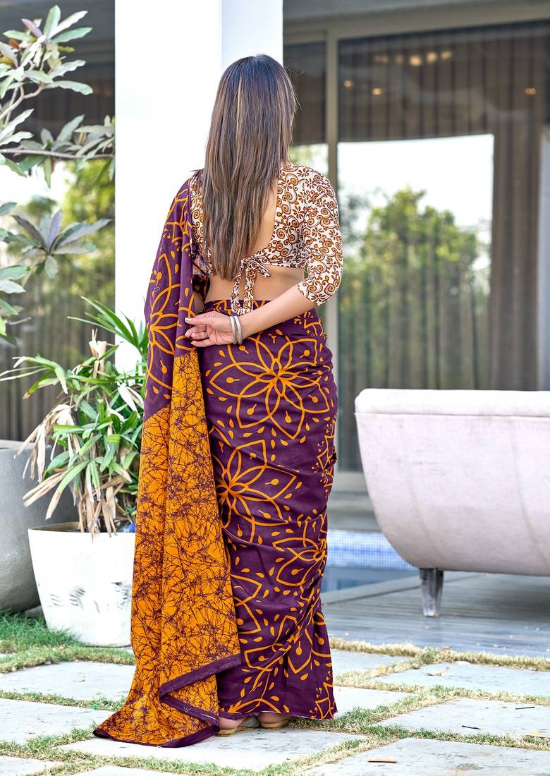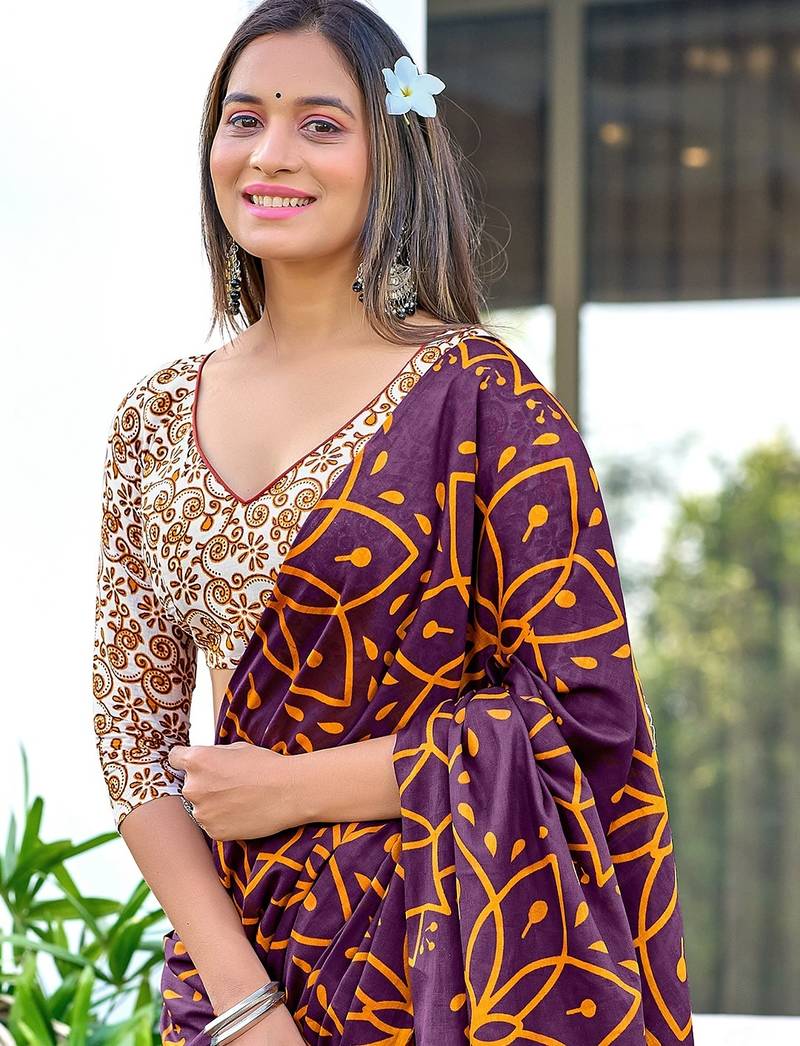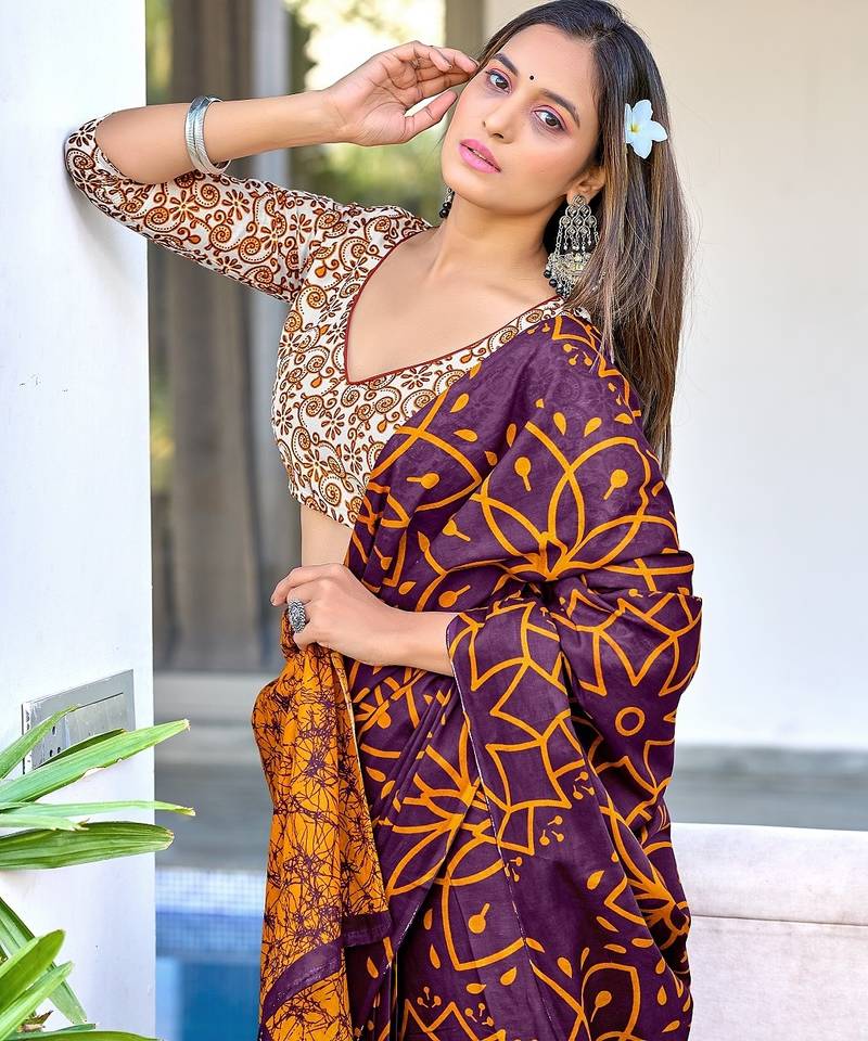 Brown block print mulmul cotton saree with blouse.