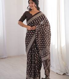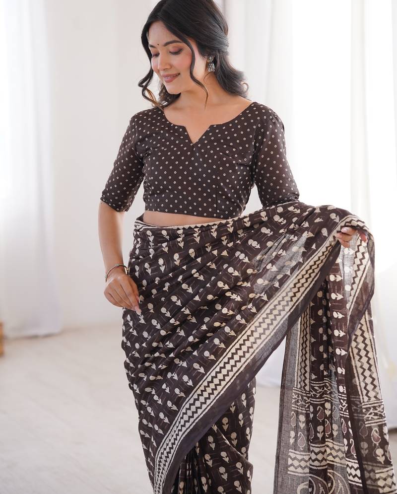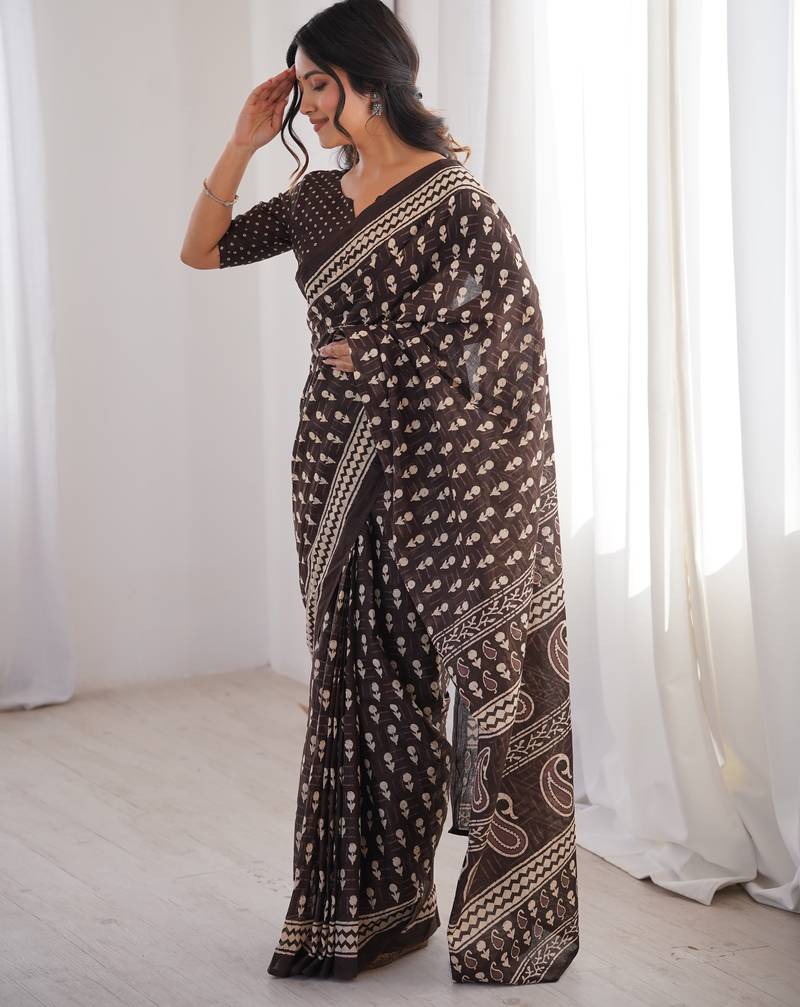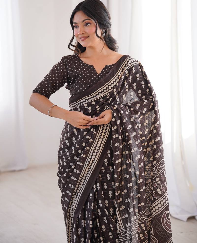 Brown blocked printed, floral print, paisley soft pure cotton saree with blouse.