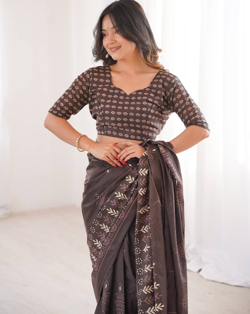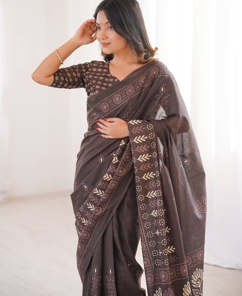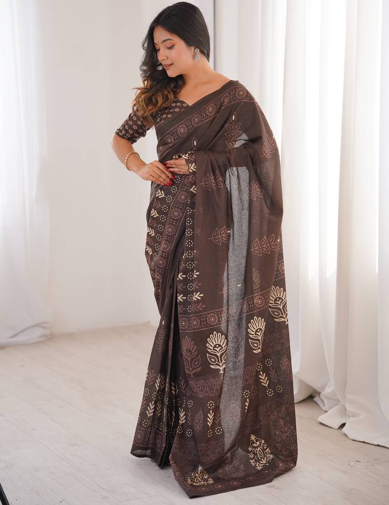 | Product Name | Brown Blocked Printed, Floral Print Soft Pure Cotton Saree With Blouse. | |