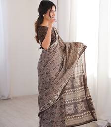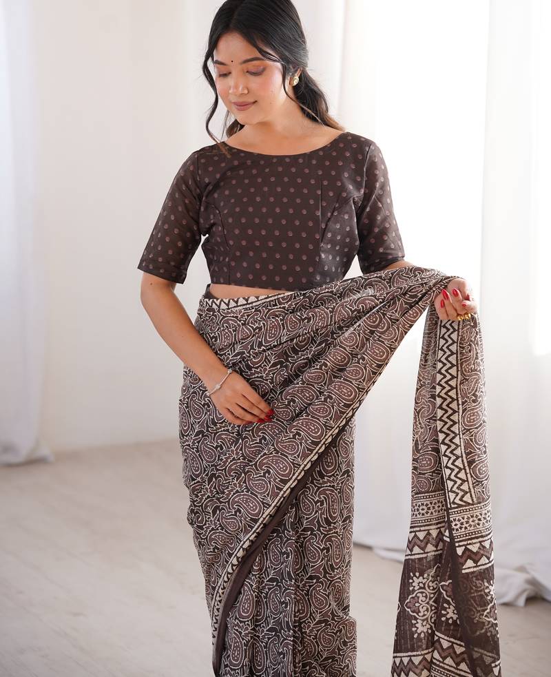 Brown blocked printed, paisley soft pure cotton saree with blouse.