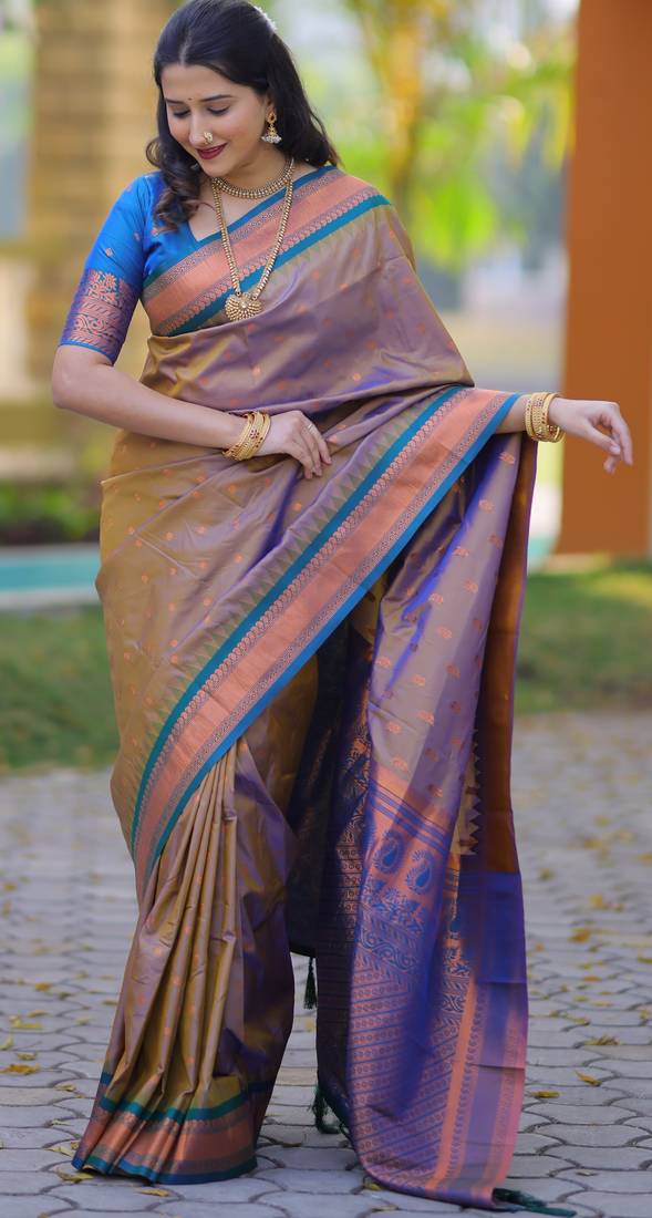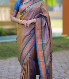 Brown floral, temple border, zari work kanji gadwal silk saree with blouse