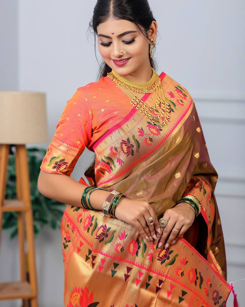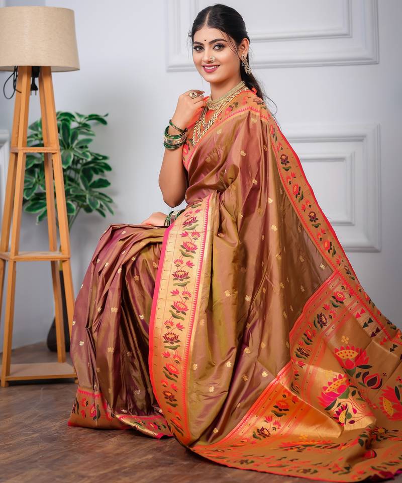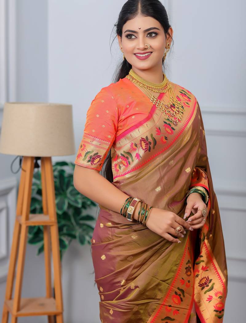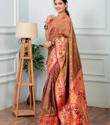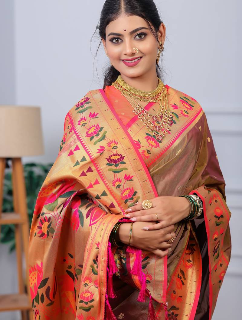 Brown floral, zari woven slik blend saree with blouse