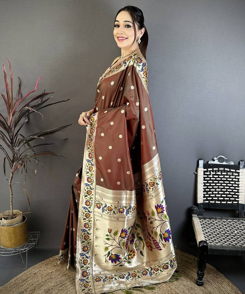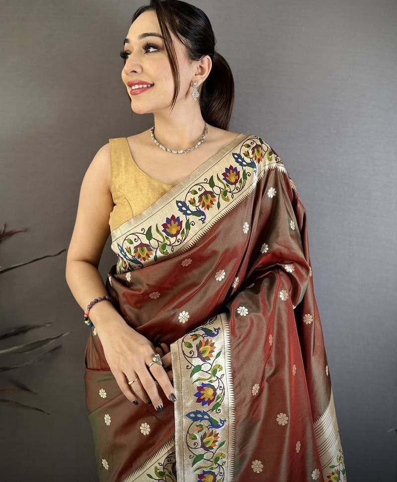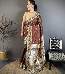 Brown floral, zari woven soft silk saree with blouse