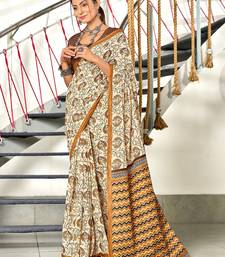 Brown floral, zigzag print mulmul cotton saree with blouse.