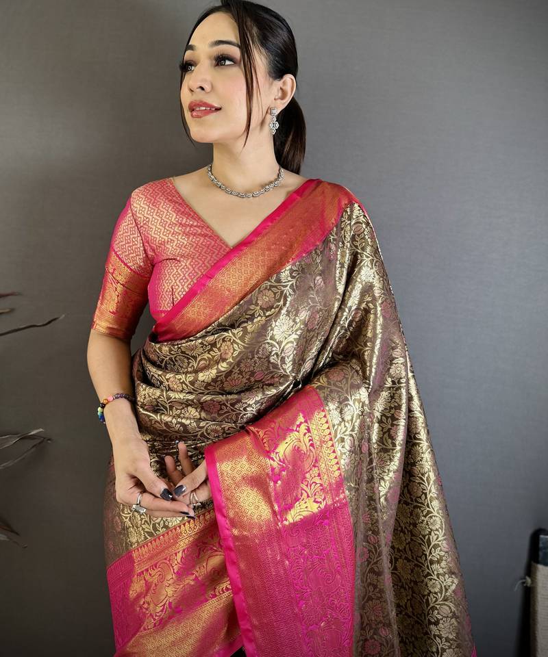 Brown, pink floral, zari woven kanjivaram silk saree with blouse