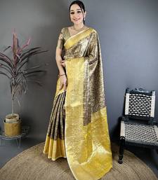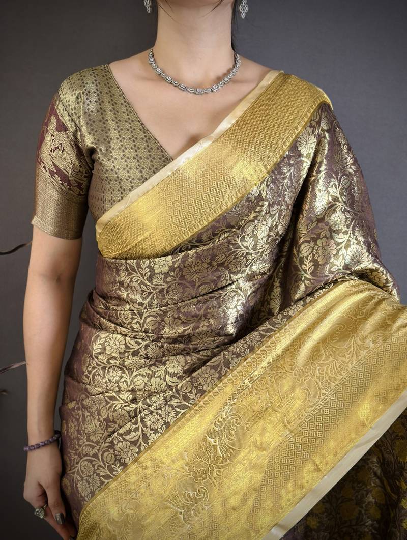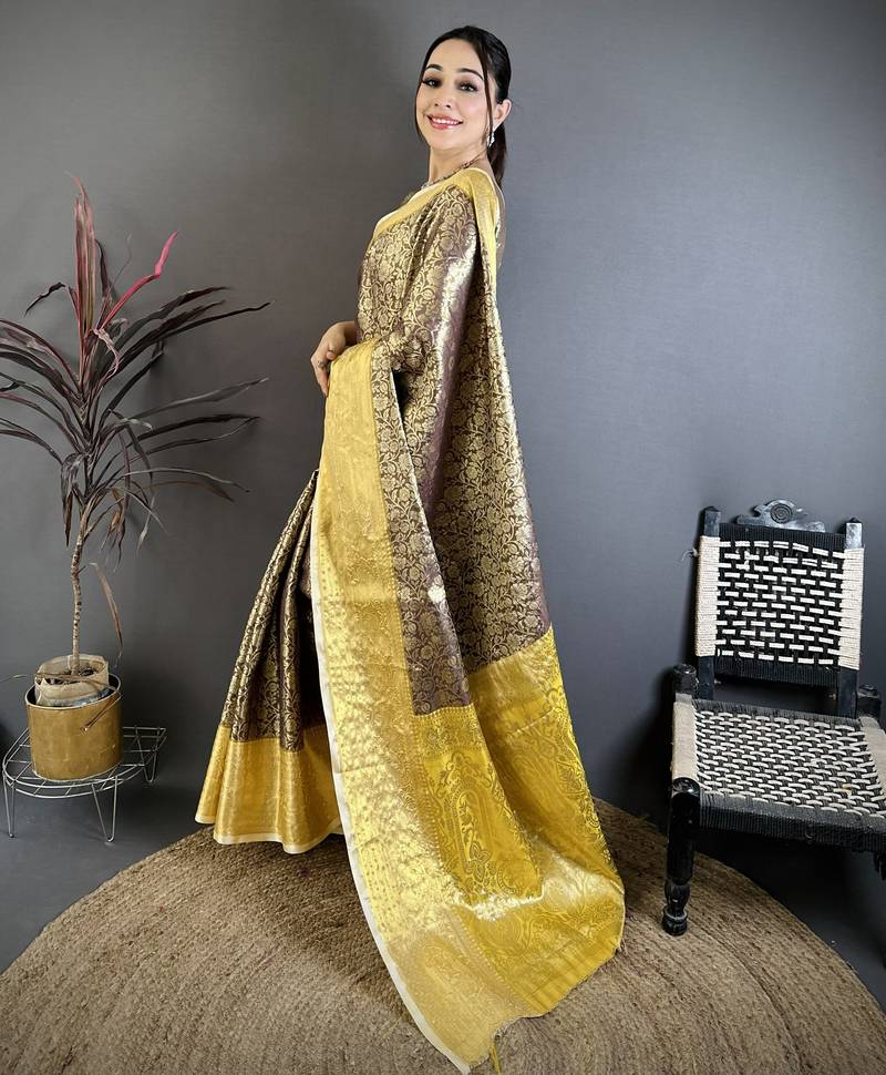 Brown, yellow floral, zari woven kanjivaram silk saree with blouse