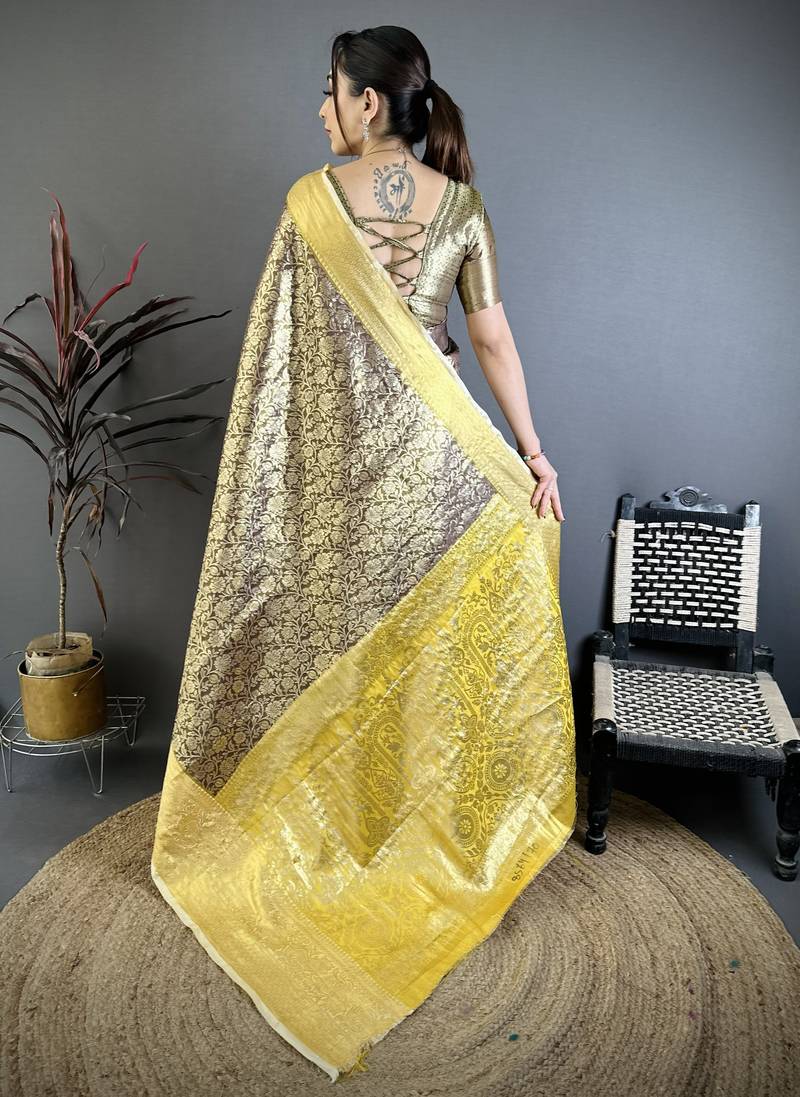 | Product Name | Brown, Yellow Floral, Zari Woven Kanjivaram Silk Saree With Blouse | |