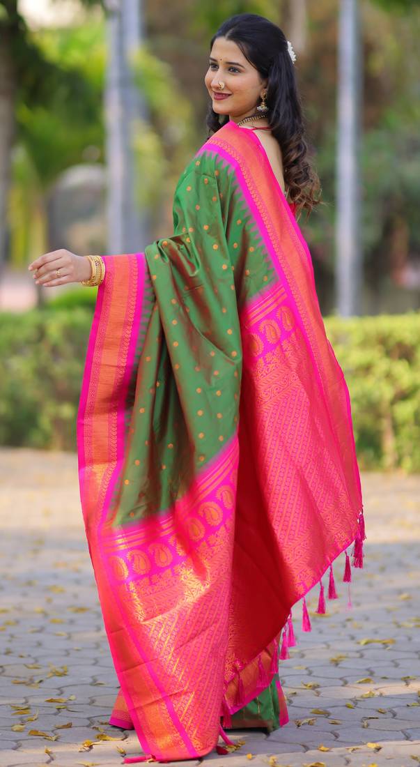 Dark green floral, temple border, zari work kanji gadwal silk saree with blouse