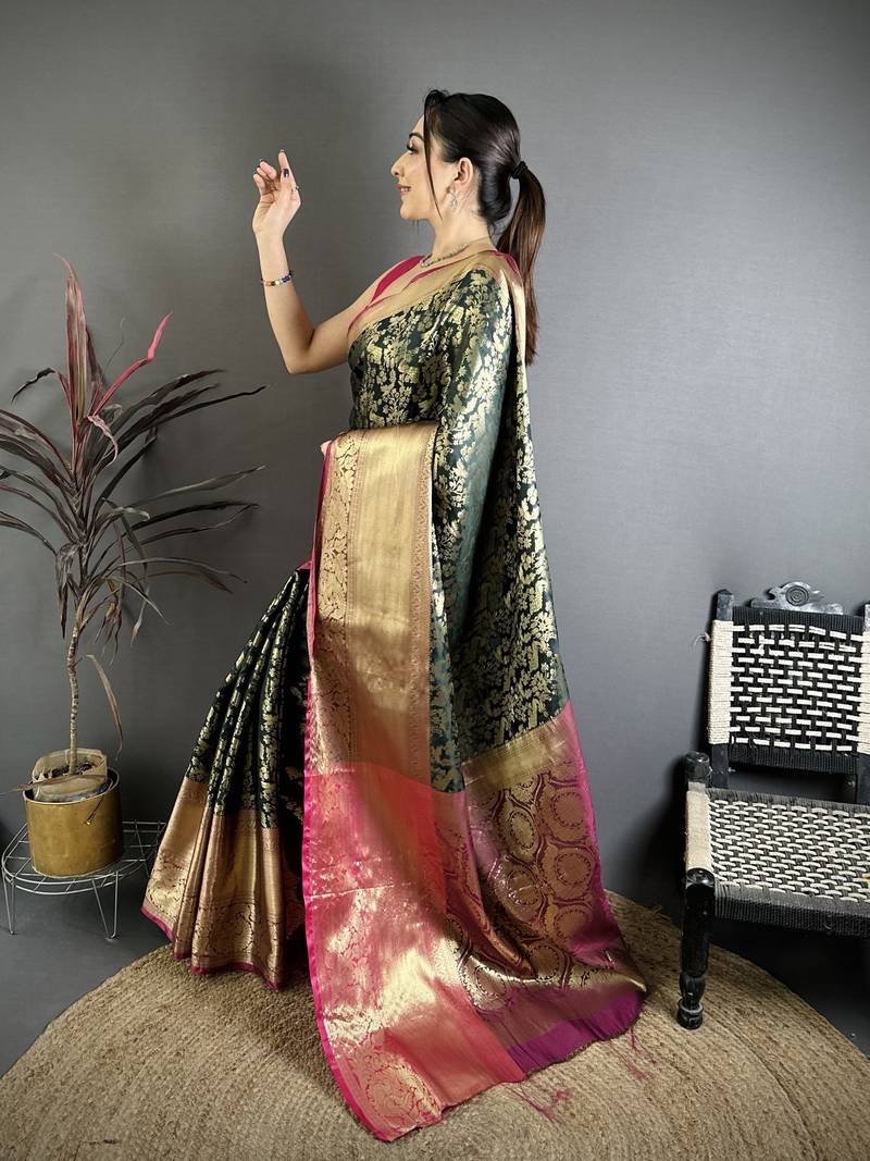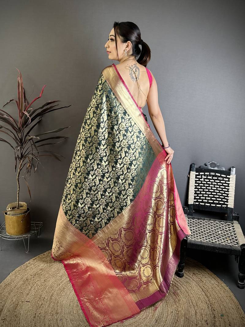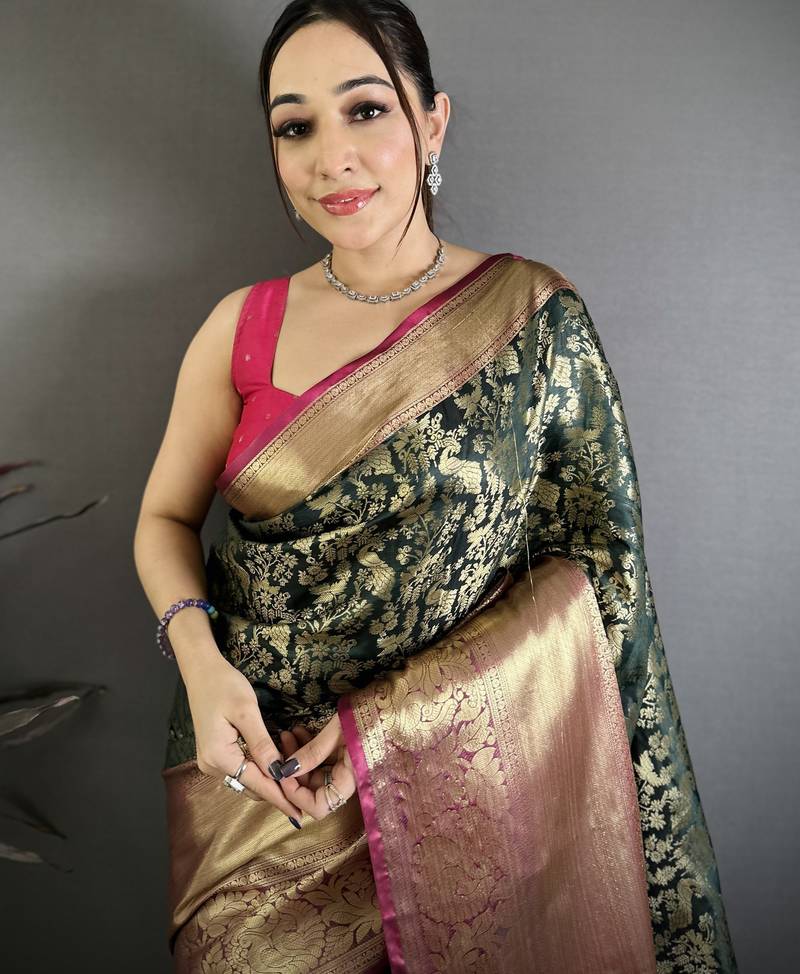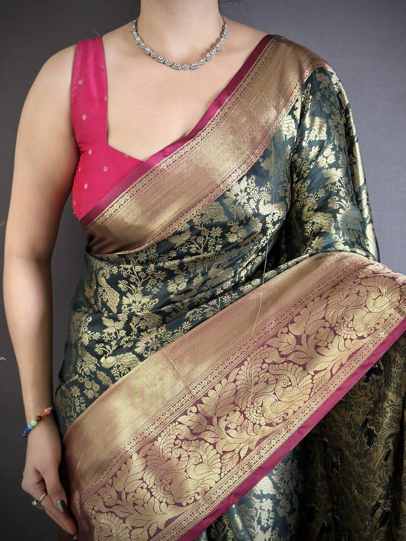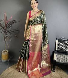 Dark green floral, zari work kanjivaram katan silk saree with blouse