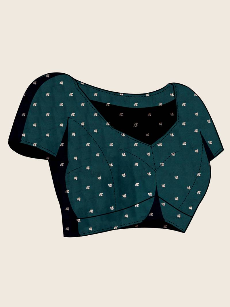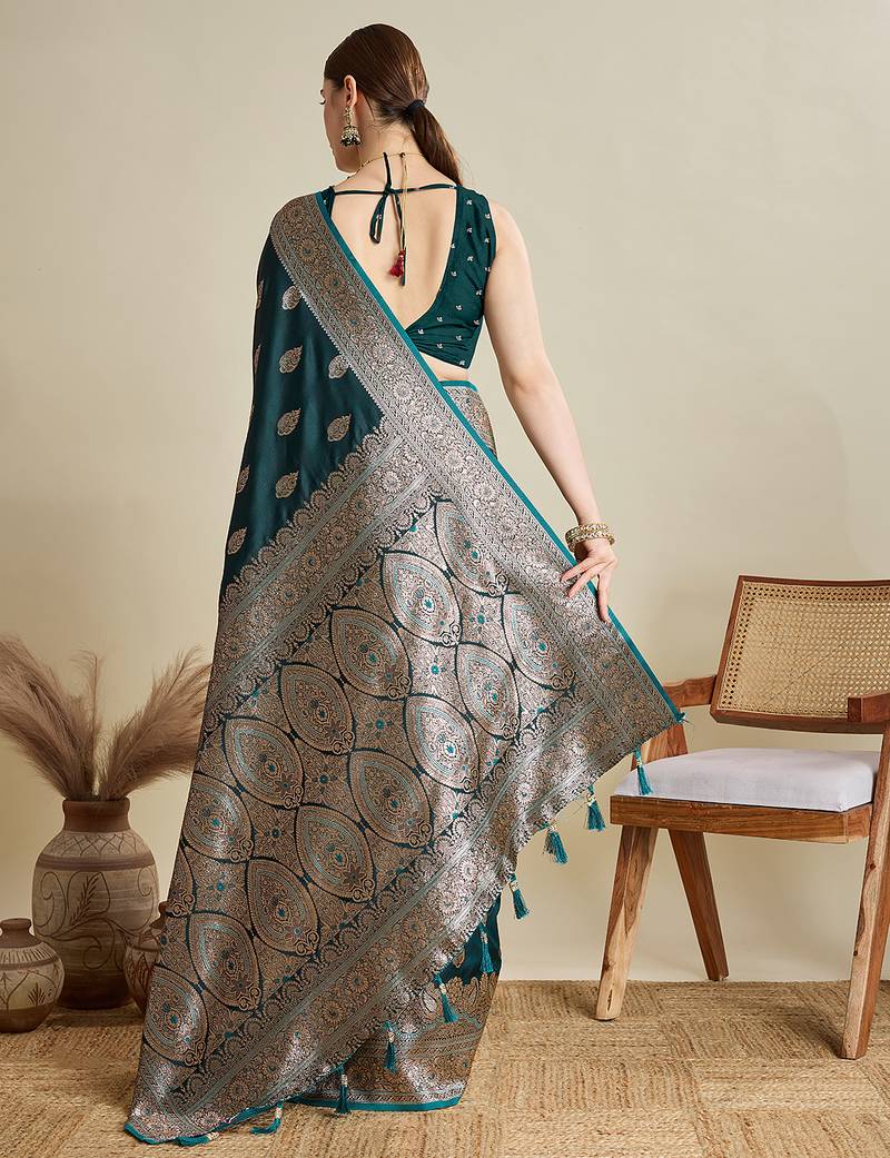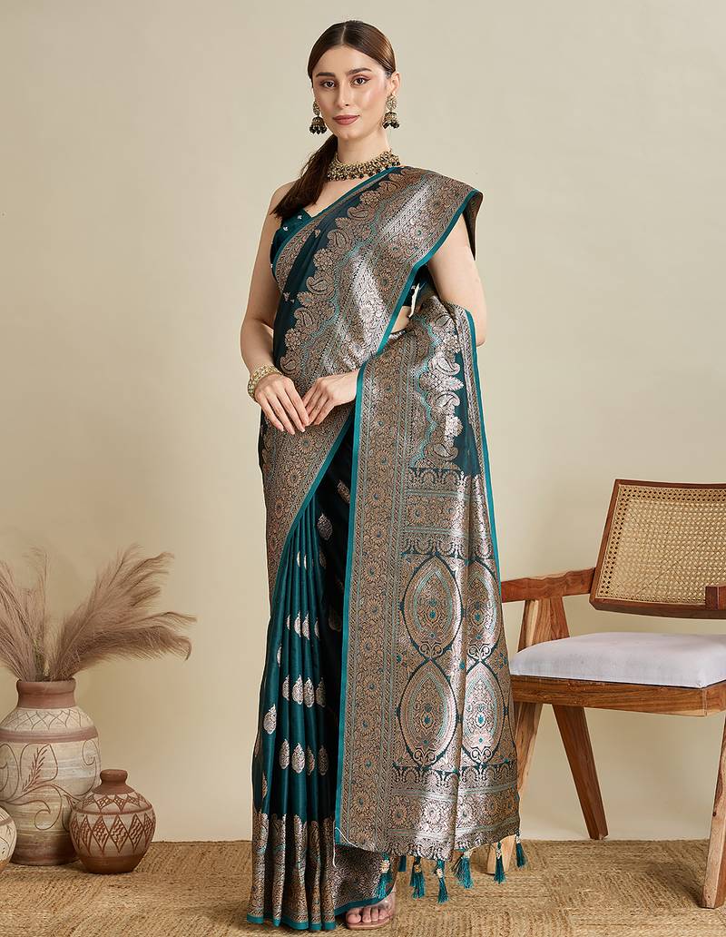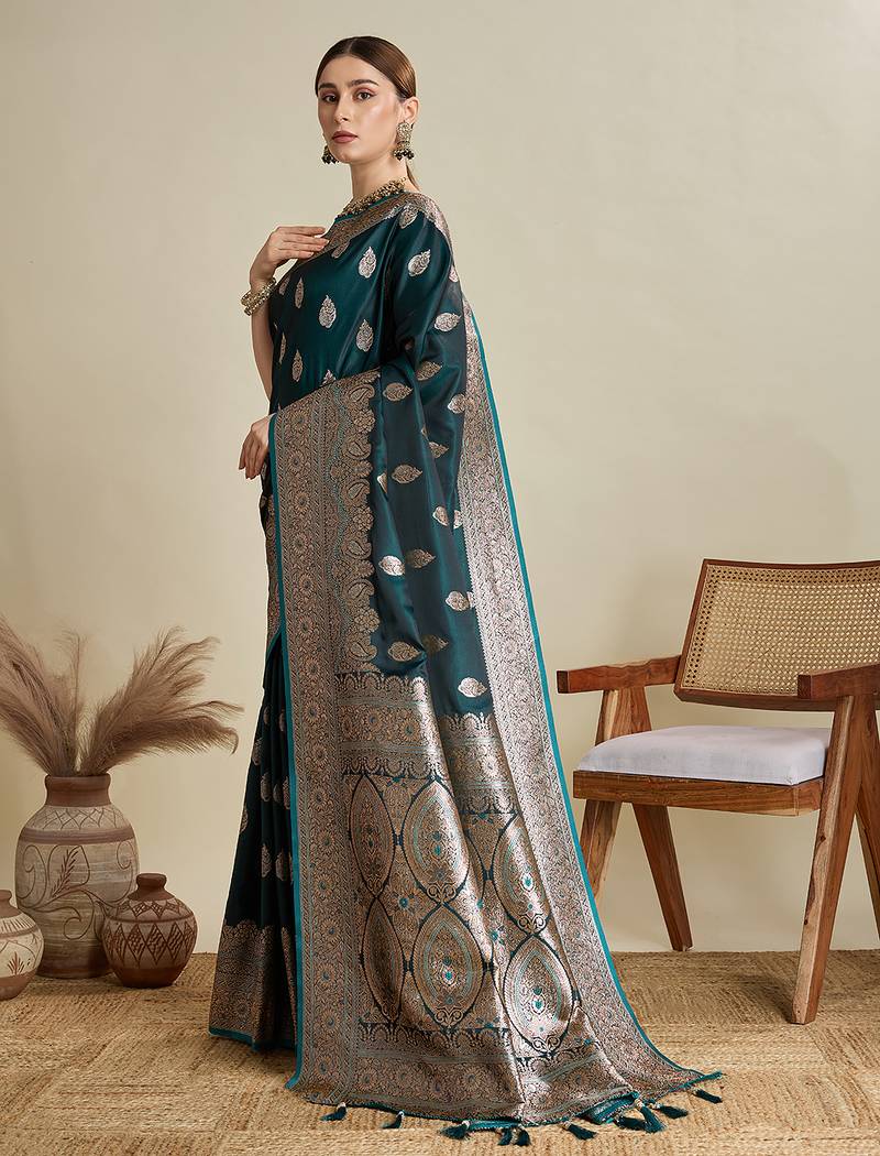 Dark green woven embellished self design satin silk blend banarasi saree with blouse