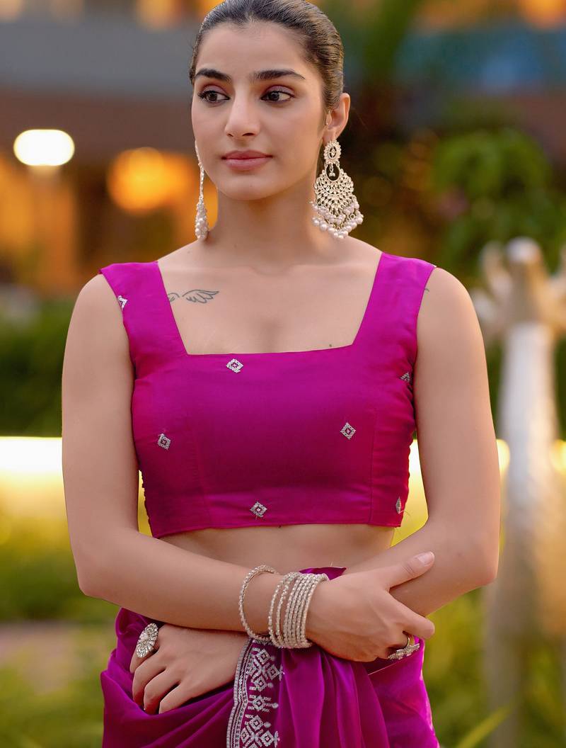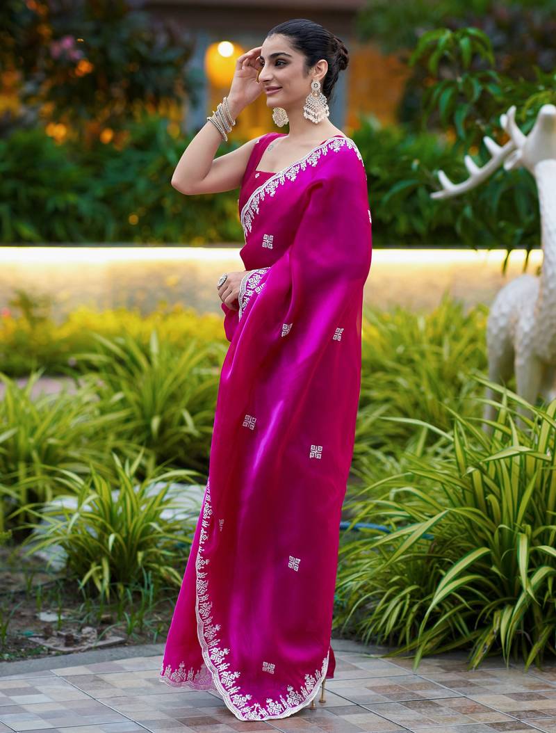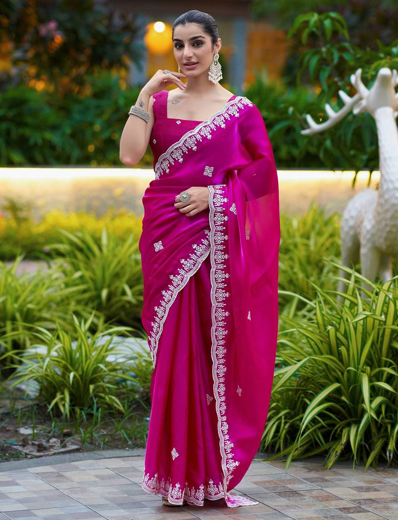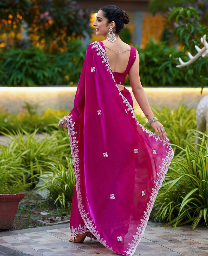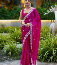 Dark pink embroidered shimmer chiffon bollywood saree with blouse