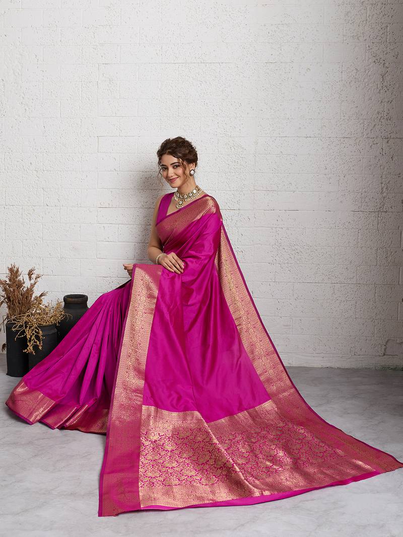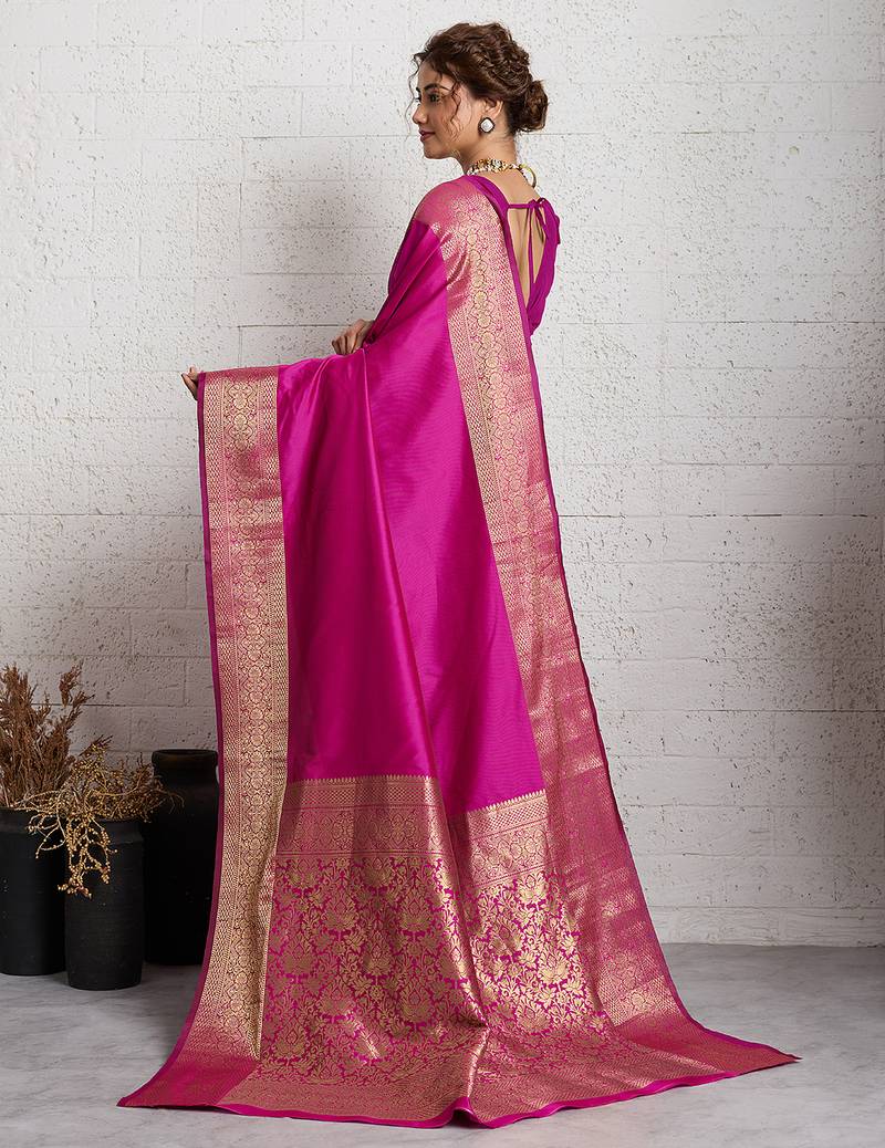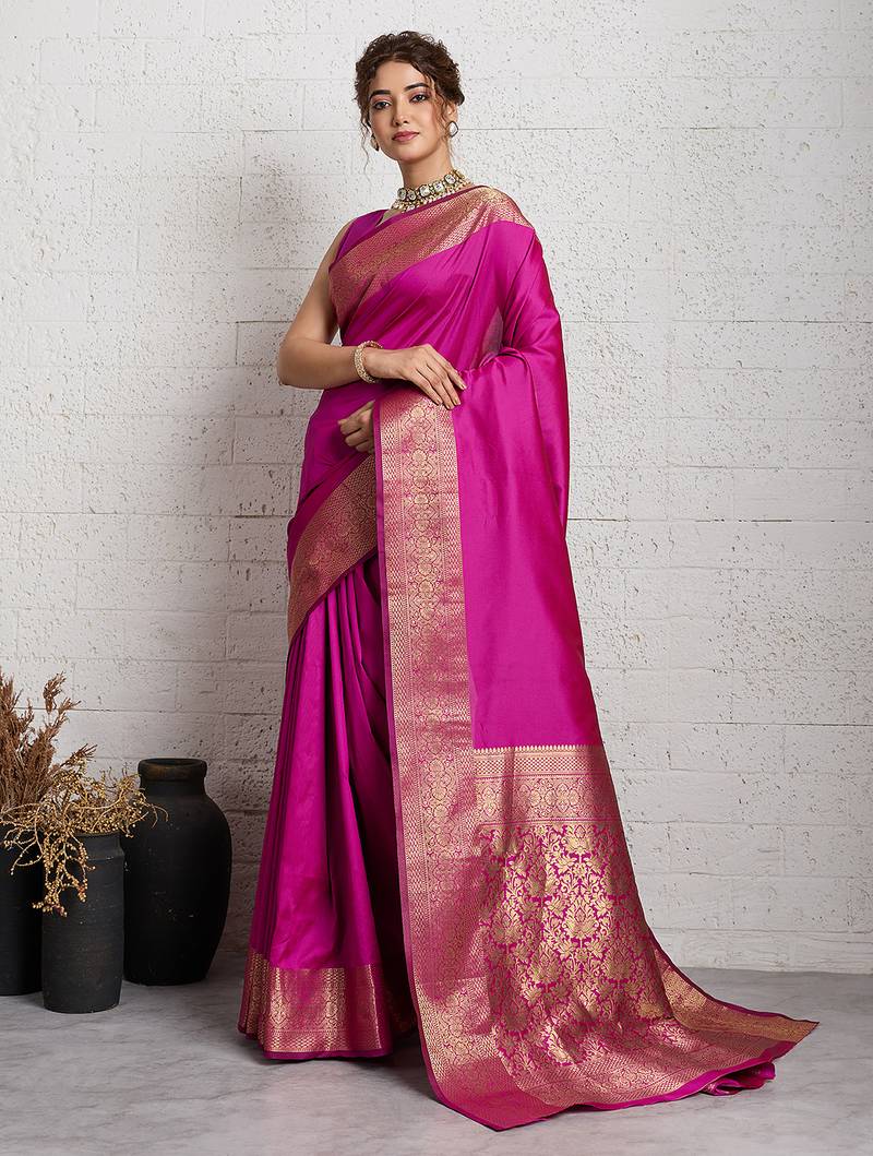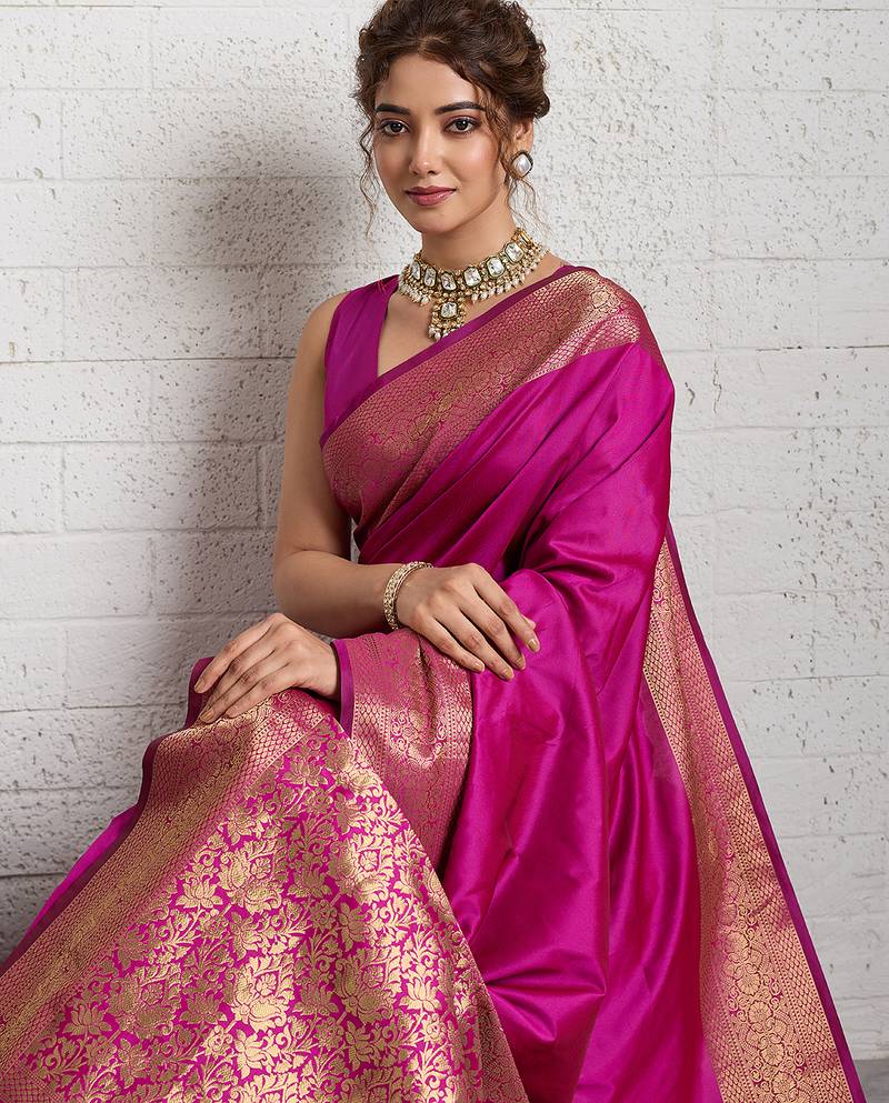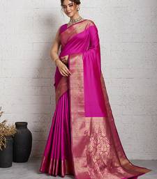 Dark pink woven, self design, embellished pure silk banarasi saree with blouse