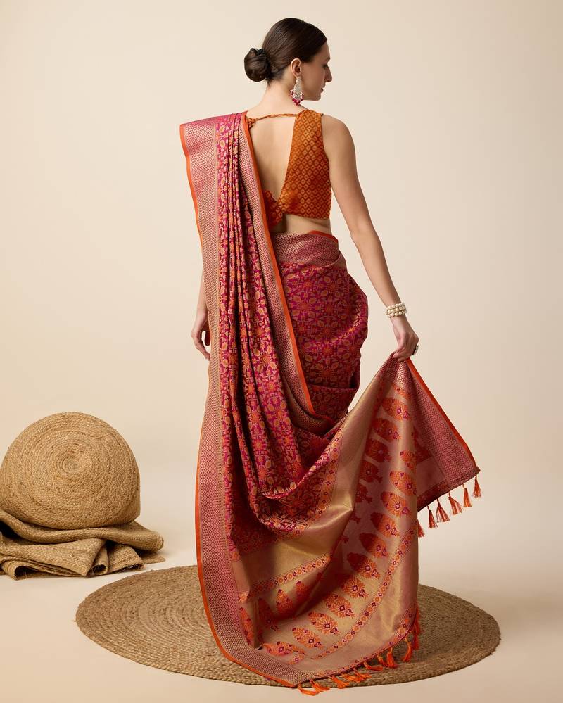 | Product Description | Presenting Banarasi Sarees For Intimate And Big Fat Indian Weddings, That Are Light On Your Skin And Uplift Your Wedding. Fabric : Pure Patola Silk Saree With All Over Contrast Patola Weaved With Contrast Meenakari And Rich Pallu With Tassels Attached |