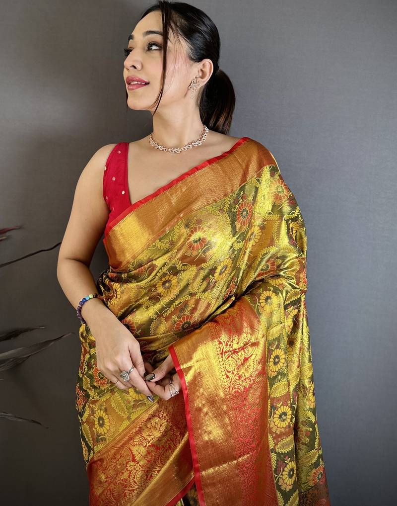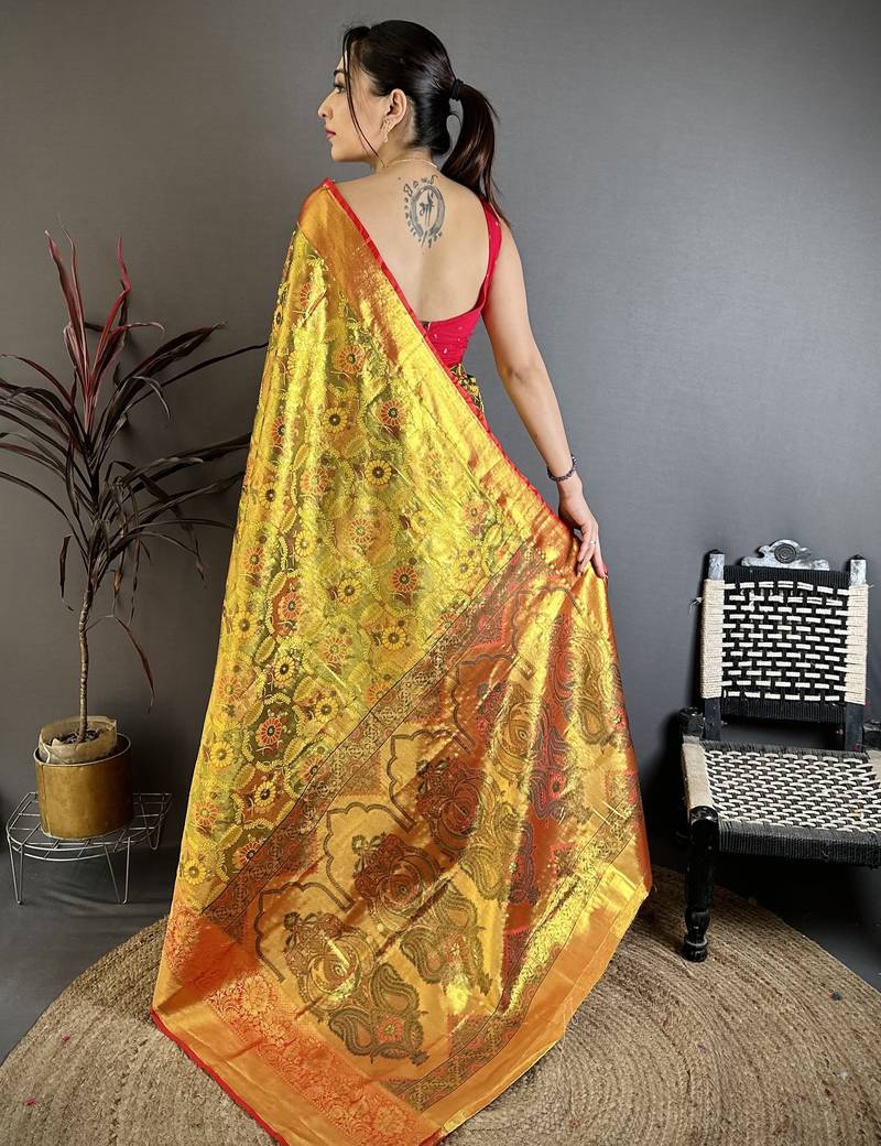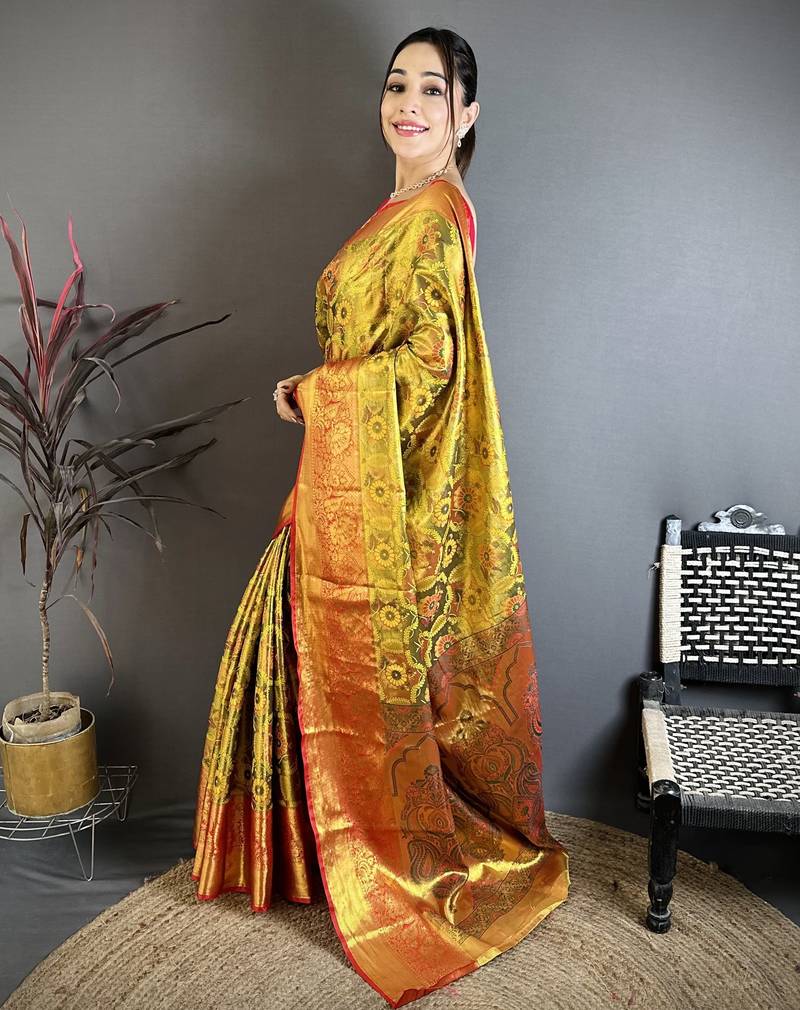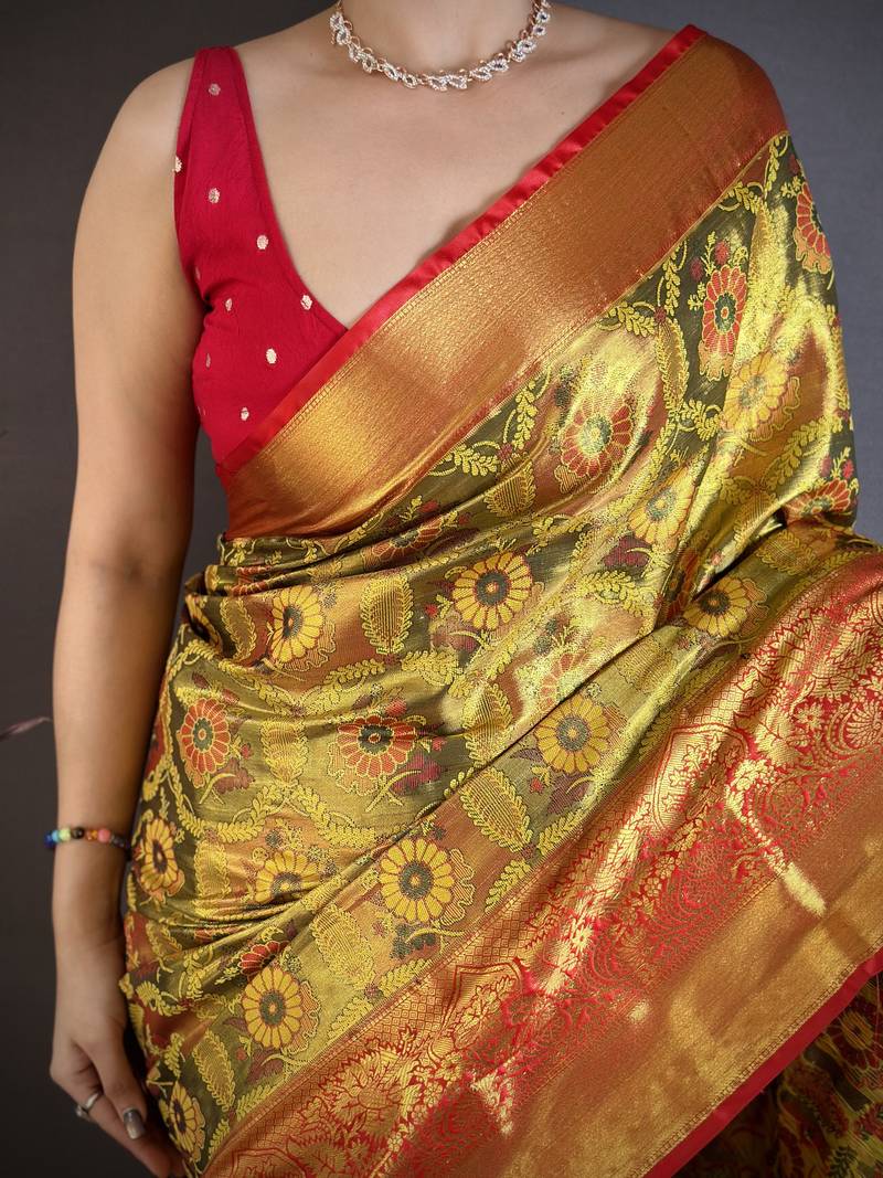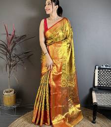Gold floral, paisely, zari woven kanjivaram semi silk saree with blouse