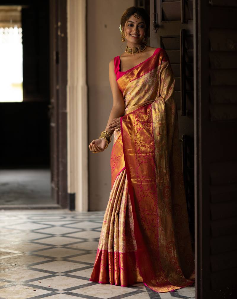 Gold floral, zari work kanjivaram semi silk saree with blouse